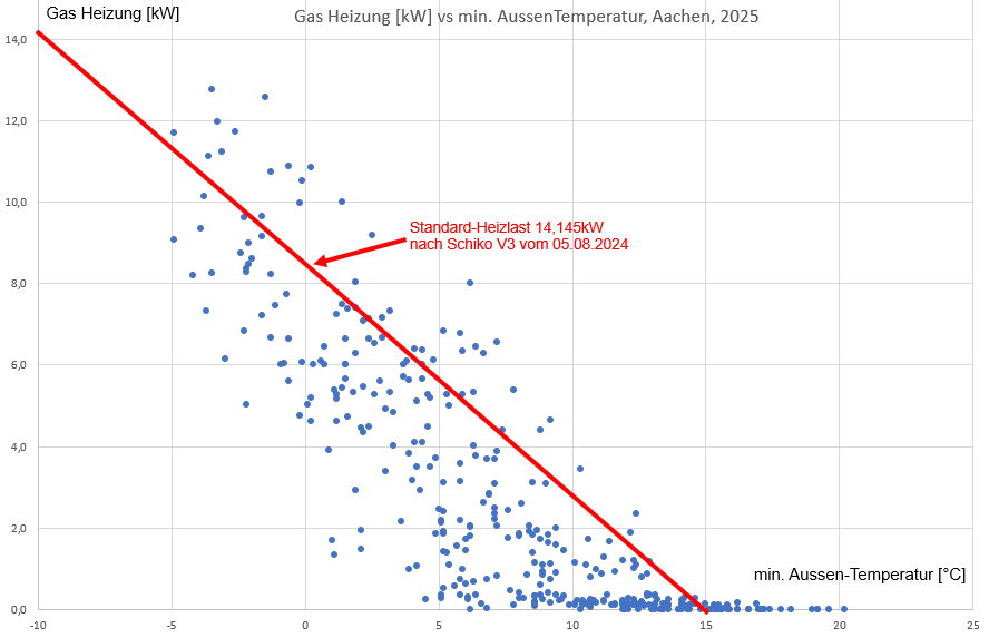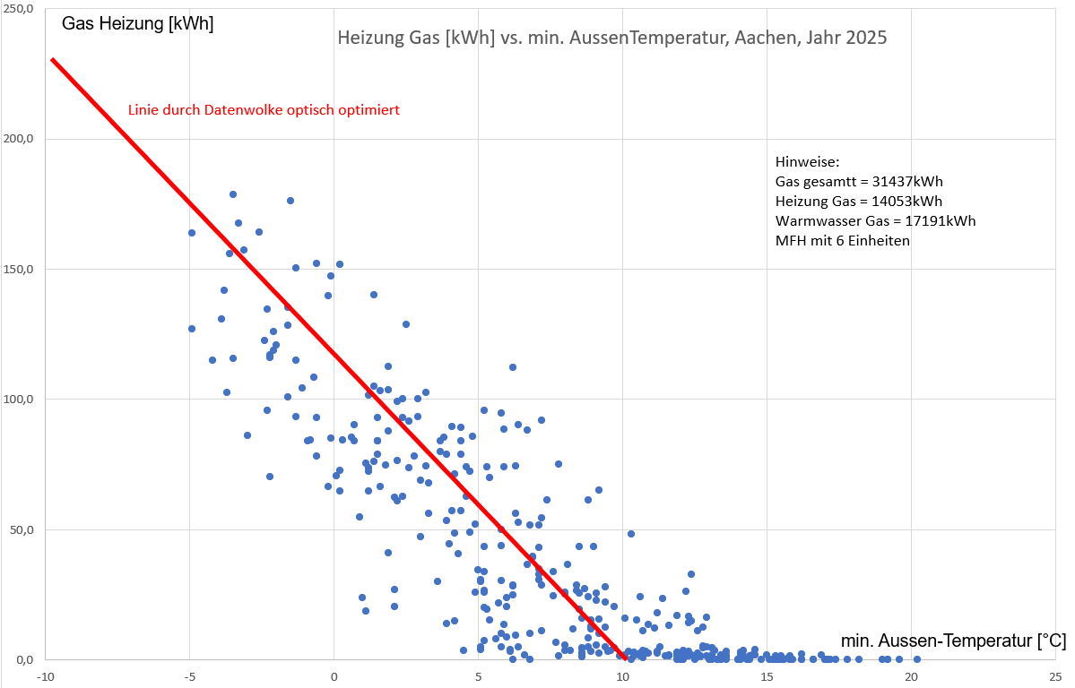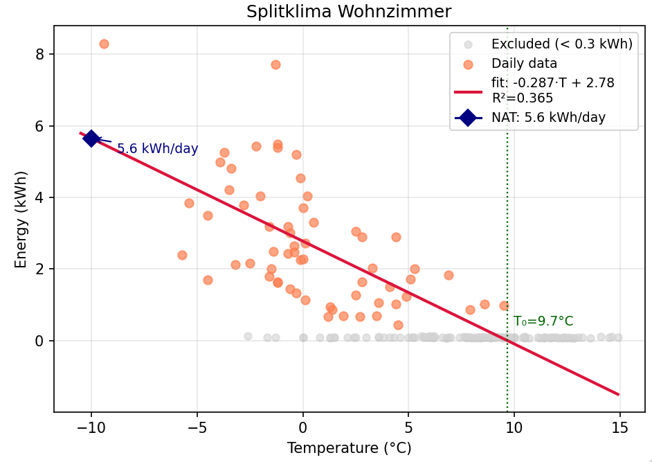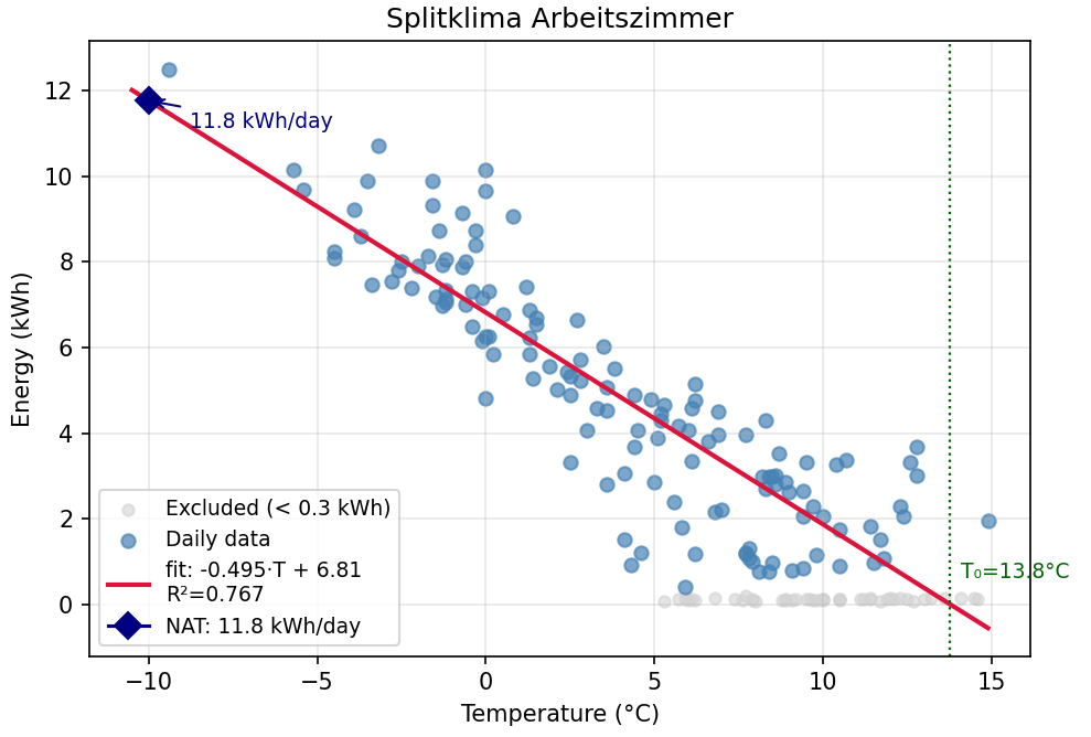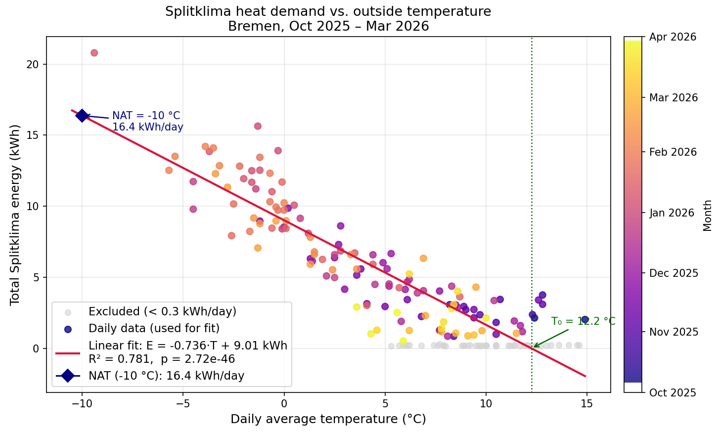 Die Splitklima unten wurde nach Bedarf (primär meiner Frau) angeworfen, oben lief sie in der Kernzeit der Heizperiode durch. Mit oder ohne Einschluß der Tage mit sehr geringem Bedarf ergibt sich in Summe eine Grenztemperatur von 11.6 bzw. 12.2 Grad, 16.3 bzw. 16.4 kWh/Tag bei NAT und eine Steigung von 0.757 bzw. 0.781, also nicht sonderlich kritisch. Mit einem angenommen COP von 4 bzw. 3.5 bzw. NAT ergibt sich aus der Regression 2.7 bzw 2.4 kW Heizlast fürs Haus aus dem einen Datenpunkt mit etwa 21 kWh/Tag 3.5 bzw. 3.1 kW Heizlast. Was in der Auswertung fehlt ist der Heizlüfter im Bad, der früh sporadisch lief (Bedeutung siehe meinen Thread mit den monatlichen Verbrauchszahlen).