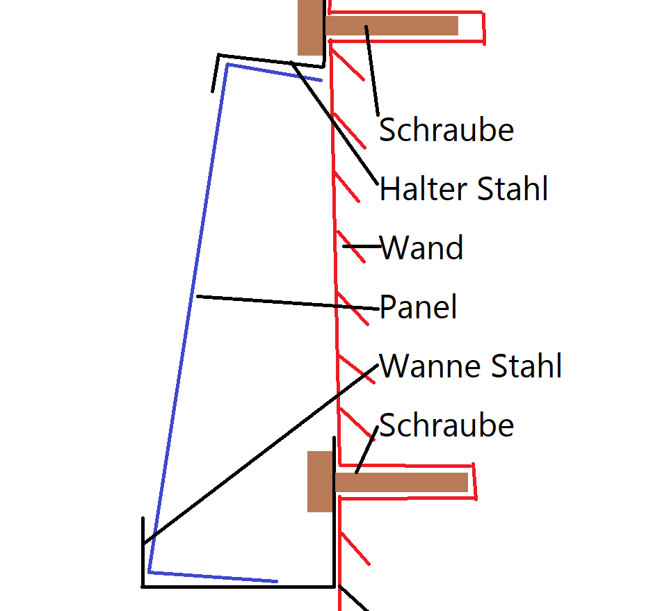 Ich hab meine Halterungen beim Spangler machen lassen bzw. selber gemacht. Blechreste + Abkante + paar Löcher. Für "schöne" Wandbefestigung würde ich das ao machen. Wanne unten Ausladung = Panel + Schraube + bissel Luft. Halter oben: Ausladung Panelstärke und jeweils 10-20mm breit, sodaß man die lösen kann falls nötig