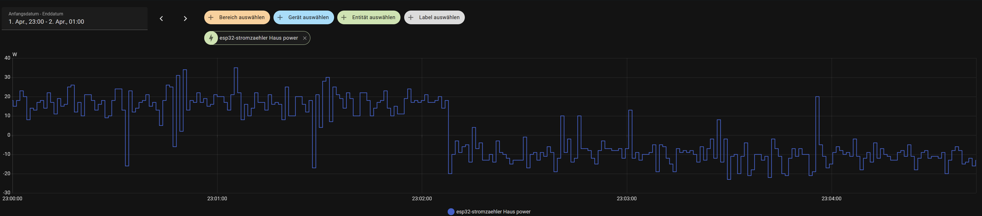 Hier 2 Bilder, wie es bei uns nachts in etwa aussieht. Die Leistung wird durch ein Shelly 3 EM am Verteilerkasten der Wohnung erfasst und Grid wird durch einen optischen Sensor direkt am Zähler erfasst.