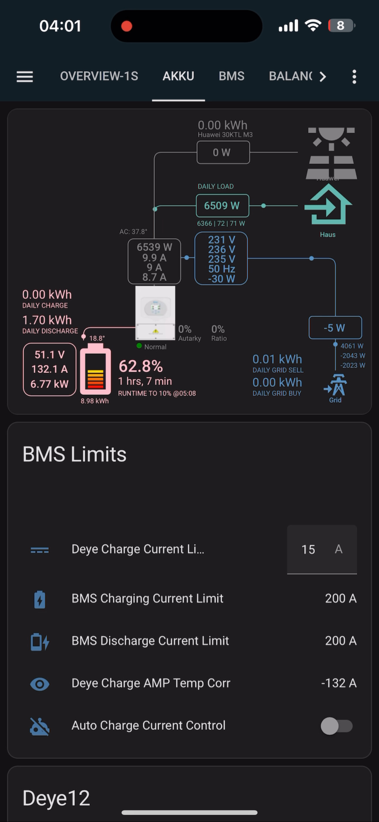 Da müsste er mal länger testen, um kurzfristige Regelschwankungen auszuschließen. Und am besten dabei das Display vom Deye in der Detailübersicht filmen, um zu sehen, wie geregelt wird.