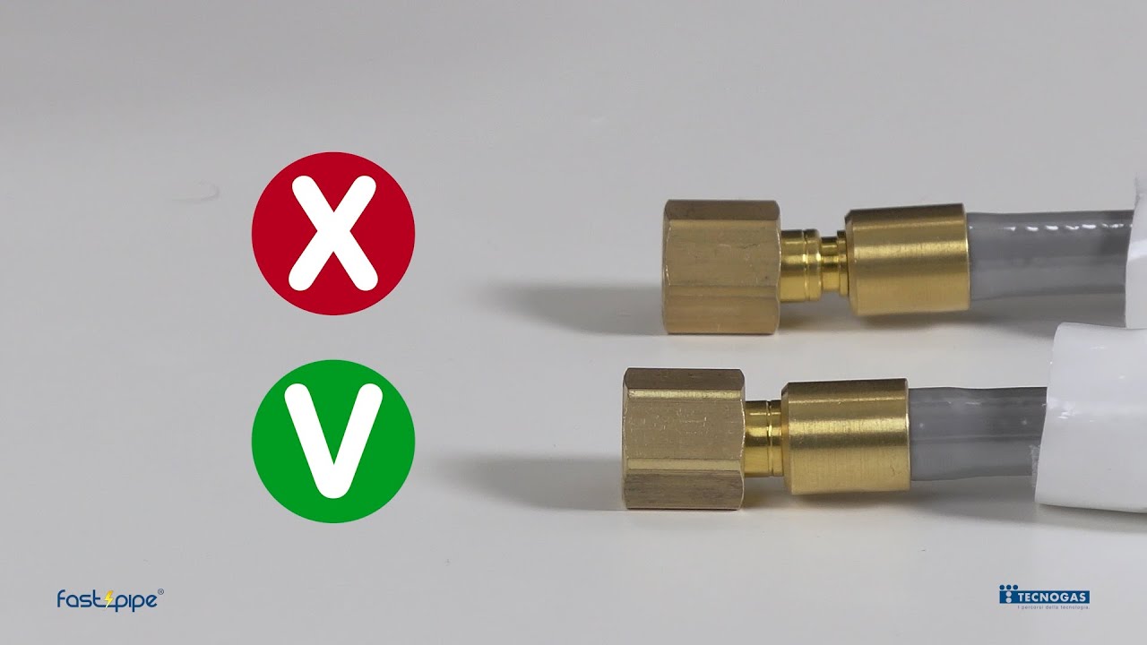 FastPipe® is compatible with the following types of refrigerant gases: R134a, R410A, R32, R404A, and R407C. FastPipe® fittings can be connected to the respective fittings of the machine (indoor and outdoor units) without the use of sealants, copper washers or the need to create folders. Simply apply spray oil to the connection cone of the fitting. Connecting FastPipe® to the air conditioner is very simple; I leave you the link to our video tutorial: from minute 8:50 you can see the entire sequence of operations for the connection: