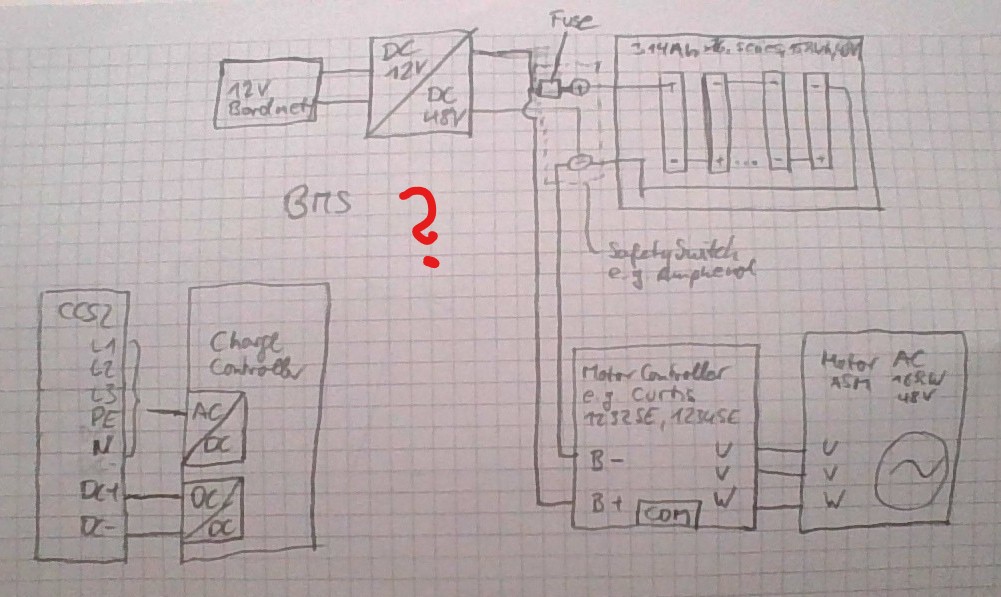 Wenn ich das ganze System auf 48V auslegen würde und überschlägig rechne, komme ich auf 16Zellen in Serie (16x3.2V=52.2V), bei z.B. LiFePo EVE Zellen wären das 314Ah bzw 48V*314Ah=15kWh elektr. Energie. Bei einem angenommenen Verbrauch von 15kW/100km wäre die elektr. Reichweite also 100km. Würde ich einen weiteren Satz parallel schalten würde sich die Kapazität und die Reichweite verdoppeln.