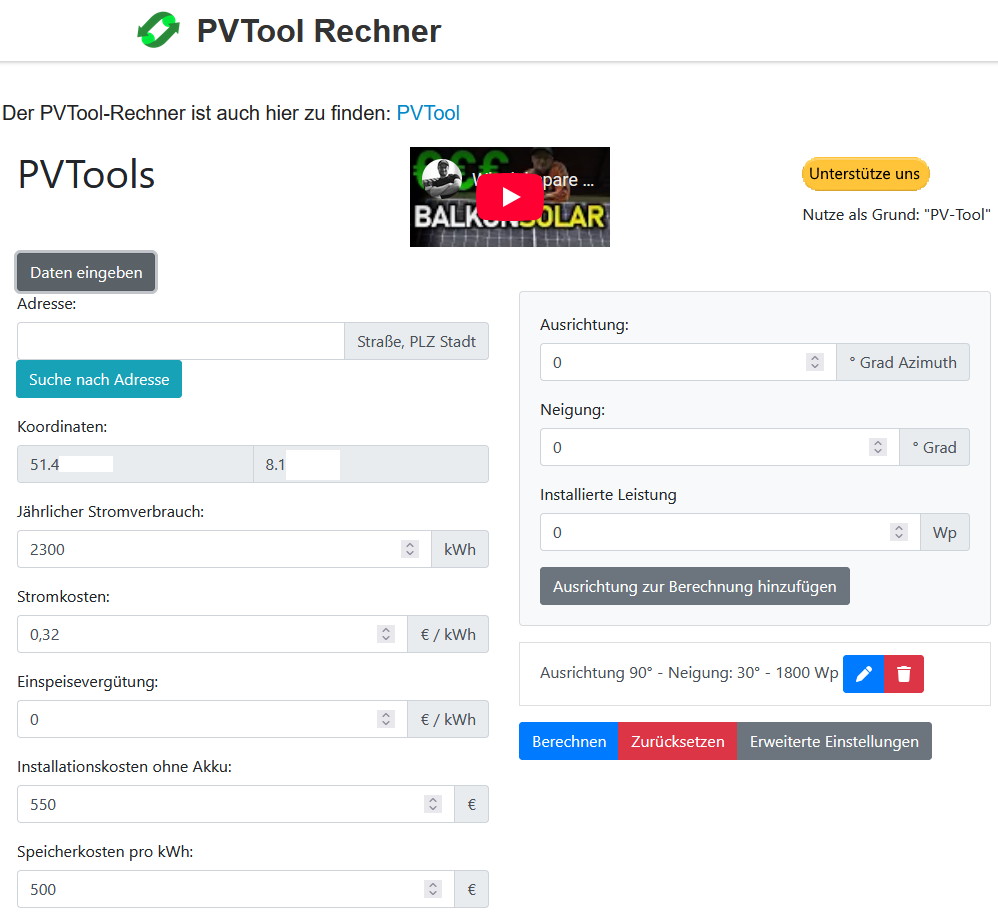 Da aber ich z.B. meinen Haushaltsstrom mit ca. 3600kWh kenne, täglich demnach so um die 10kWh draufgehen, ich aber im Winter mit Klimasplits heize, kann ich den Rechner mit der Akkuamortisation nicht perfekt nutzen. Einfacher wäre es, wenn man monatliche Mittelwerte eingeben könnte.