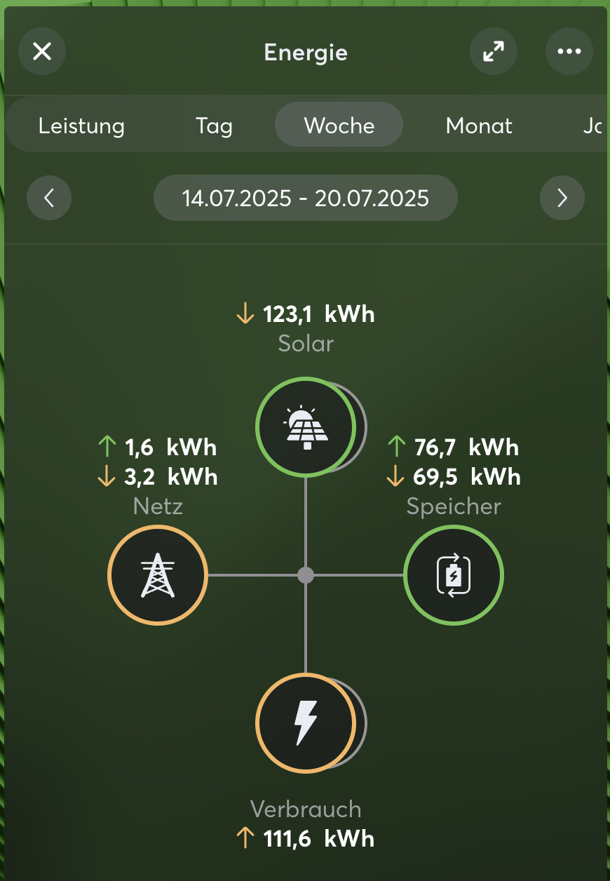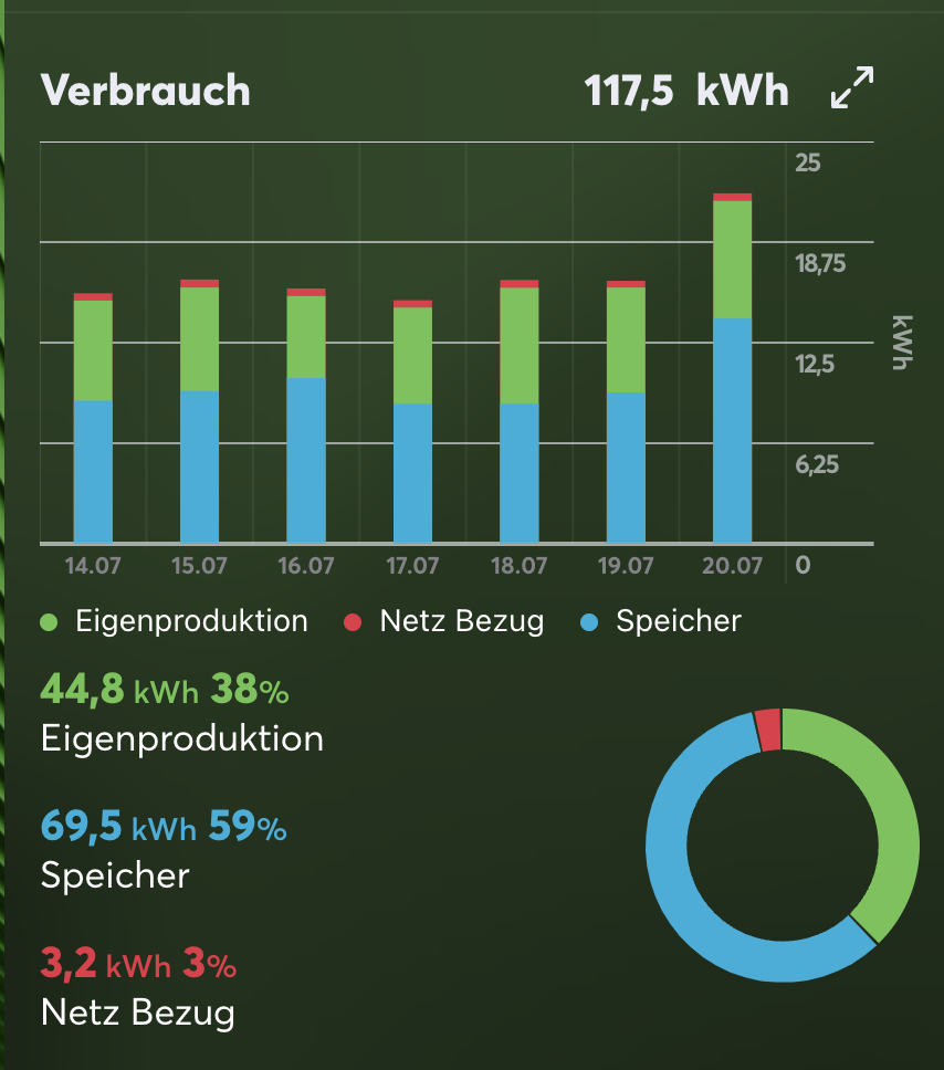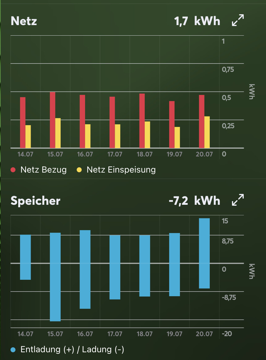 Wenn ich die split klimaanlagen im schlafzimmer im DG auch tagsüber laufen lasse, komm ich auch ohne eAuto schon mal auf 20 kwh pro Tag. Das schafft meine Inselanlage locker. Da macht sich bemerkbar, dass das Dach südwestseite hat und nicht so gut gedämmt ist wie das EG. Das haus hat 30 cm Ziegelstein. Im Dach gibts nur steinwolle. Die klimaanlage oben braucht einiges mehr als die im EG.