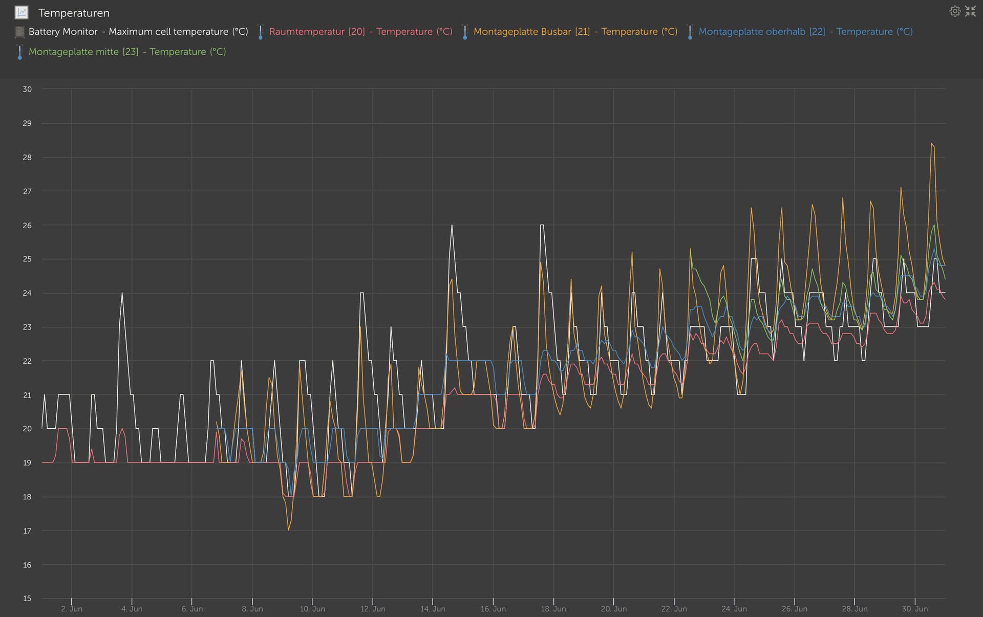 Was ich schon mal dranhängen kann, der Temperaturverlauf meines Nebenraums im Erdgeschoss (Bruchstein >60cm Wandstärke) in dem die Technik der Solaranlage steht