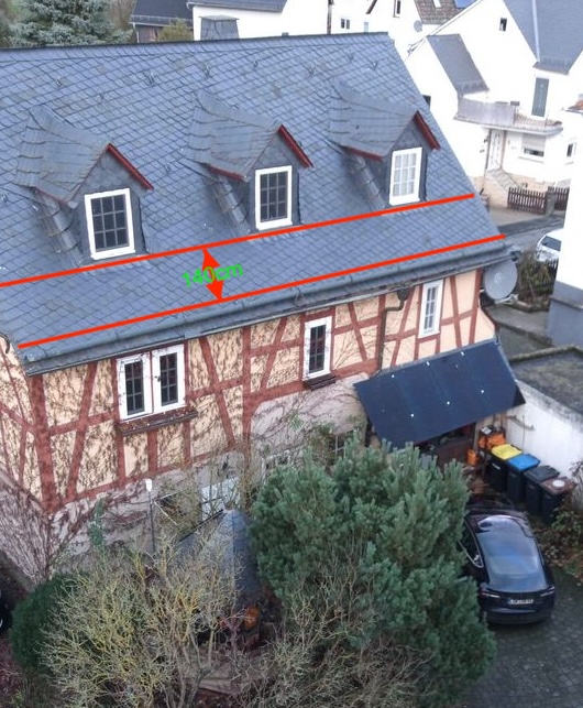 Aber das Dach hat halt Gauben und ist Naturschiefer eingedeckt. Meines Erachtens würden über und unter den Gauben jeweils 6 Module quer drauf passen.