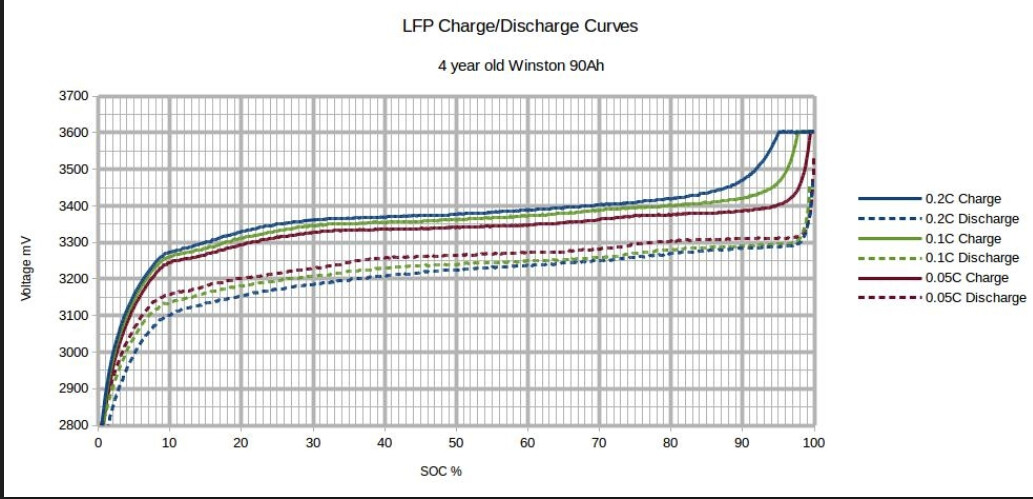 selbst ein komplizierter Luxus Balancer hätte keinen Sinn, wenn er bei halb voller Batterie, möglicherweise noch beim Entladen, arbeitet. Und er fängt auch nur an zu arbeiten, wenn eine gewisse Spannungsdifferenz überschritten wird. Sinnvollerweise arbeitet er nur, wenn die Batterie fast voll wird und möglichst nur bei geringem Ladestrom. Nur da ist die Kurve so steil, dass geringe SOC Unterschiede eine Spannungsdifferenz von zum Beispiel 20mV hervorrufen. Achte auf die 0,05C Charge-Kurve. Sie stmmt zwar von LiFePo4 Zellen, aber das Verhalten ist ähnlich.