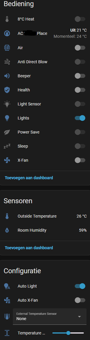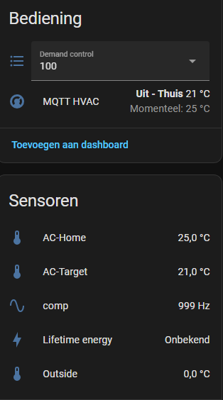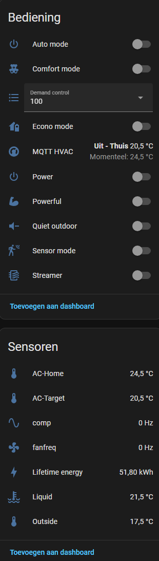 Das teurere Daikin funktioniert OK mit dem nicht so teuren Faikin-Esphome-Modul. Es zeigt interessante Statistiken an, wie beispielsweise die Temperatur der Flüssigkeit in den Leitungen. Allerdings muss man oft mehrere Befehle senden, damit das Daikin reagiert. Das günstigere Daikin-Modell verfügt ebenfalls über ein Faikin-Modul, funktioniert jedoch noch schlechter. Es aktualisiert die Temperatur in Home Assistant erst, wenn Sie das Faikin-Modul neu starten. Er reagiert zwar auf Befehle, braucht aber manchmal mehrere Wiederholungen.