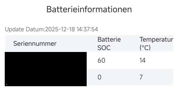 Zur Frage: Könnte mal jemand drauf achten wieviel Prozent der Ladung der Speicher in 12 dunklen Stunden verloren gehen, wenn nicht eingespeist wird? Also im “Batterie first” Modus. Meine Noahs verbrauchen ca. 25 Watt, nur für das Überleben und das WLAN. Scheint mir sehr viel…. Danke.