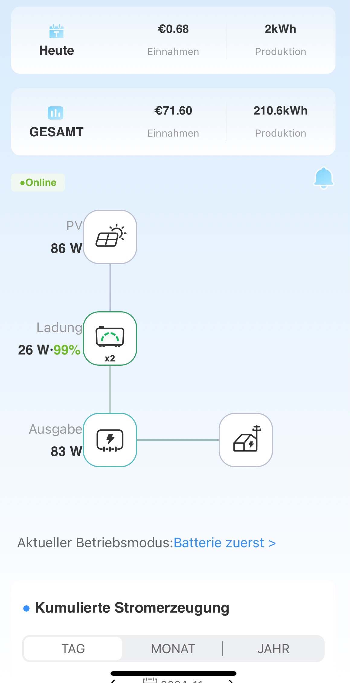 Am Samstag war hier im Saarland ein sehr gutes Wetter, und die beiden Growatts wurden sehr gut aufgeladen. Dabei haben sich auch die beiden Ladestände der Noahs (bisheriger Unterschied bis zu 25 %) angeglichen und synchronisiert.
