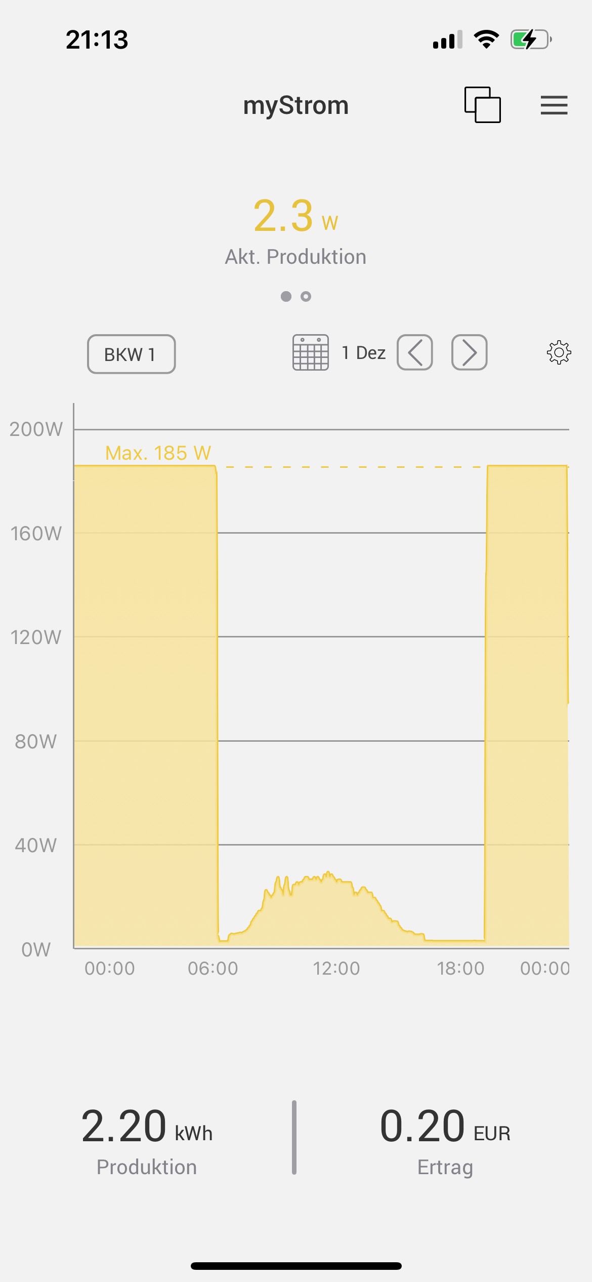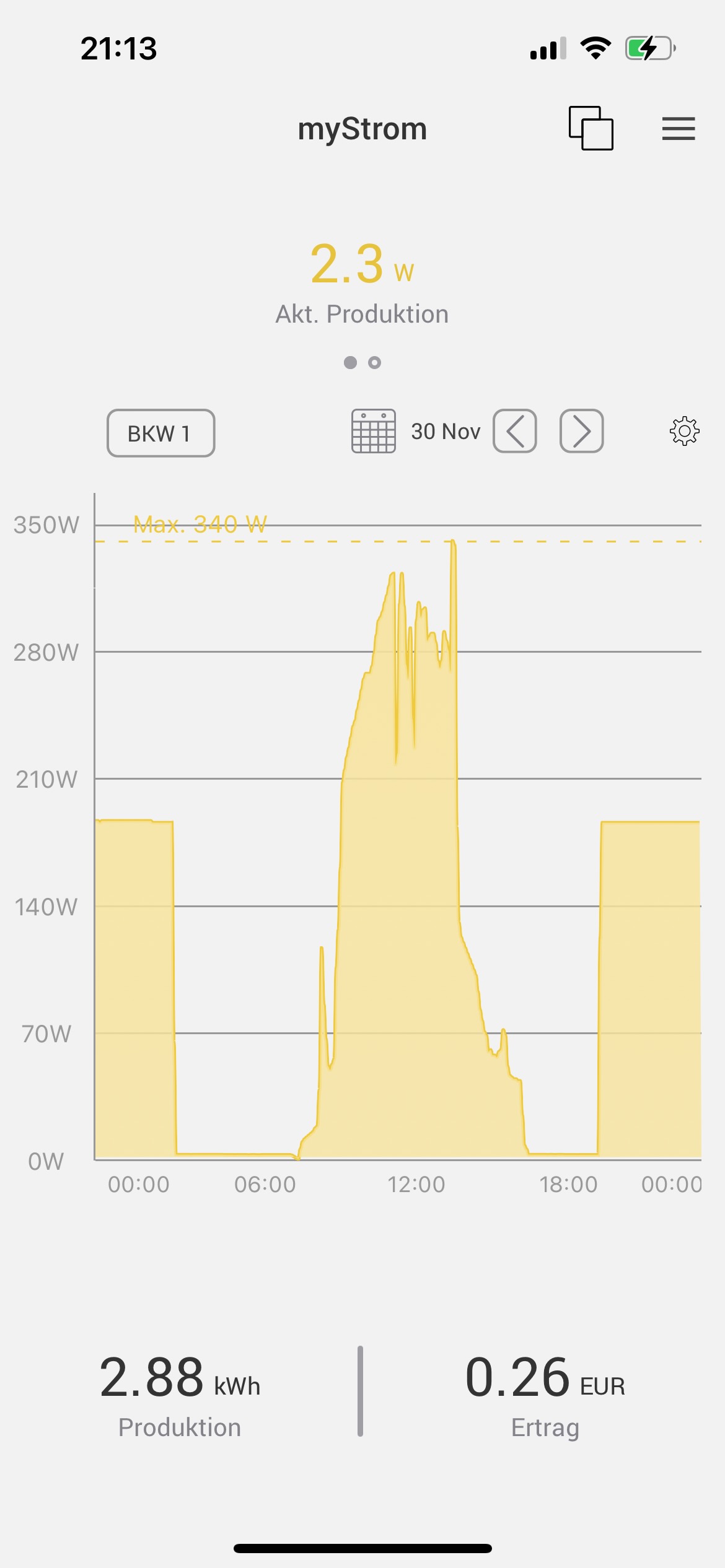 Rechnerisch müssten am 30.11.2024 über 4 kWh produziert worden sein, was über die Einspeisungen am 30.11. und am 01.12.2024 anhand der MyStrom App registriert wurde (EinspeiseBilder siehe oben), angezeigt in der Shine-App 2,1 kWh.