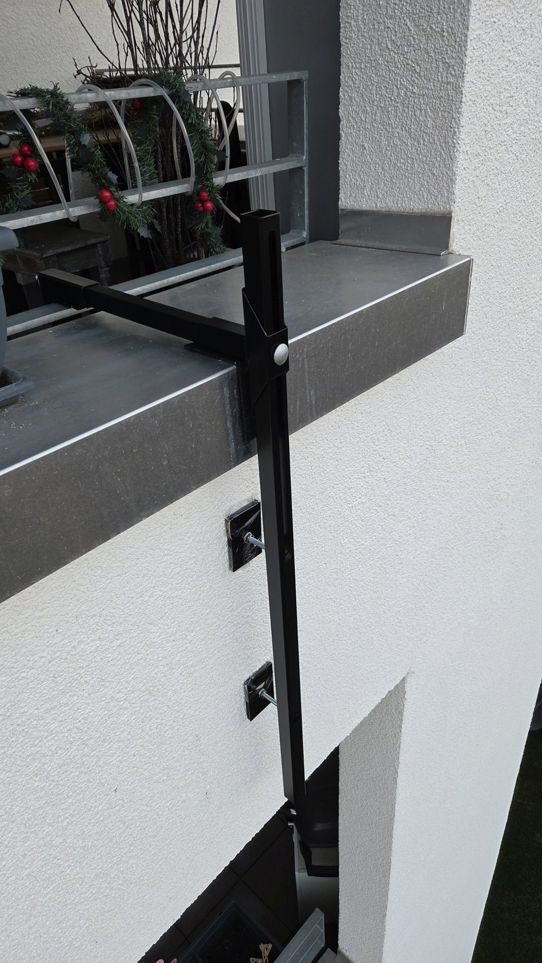 In die Fassade werde ich wohl nicht bohren dürfen. Also suche ich Vorschläge und Ideen für eine Befestigung, die ich in drüberhängen kann. Ggf. kann ich sie auf der Innenseite des Balkons verschrauben. Dort ist schon Vermieterseitig eine Art kleines Stahlgeländer verschraubt. Für Blumenkästen. Zur Fassade hin könnte man das Gewerk nur unten abstützen, aber eben nicht verschrauben.