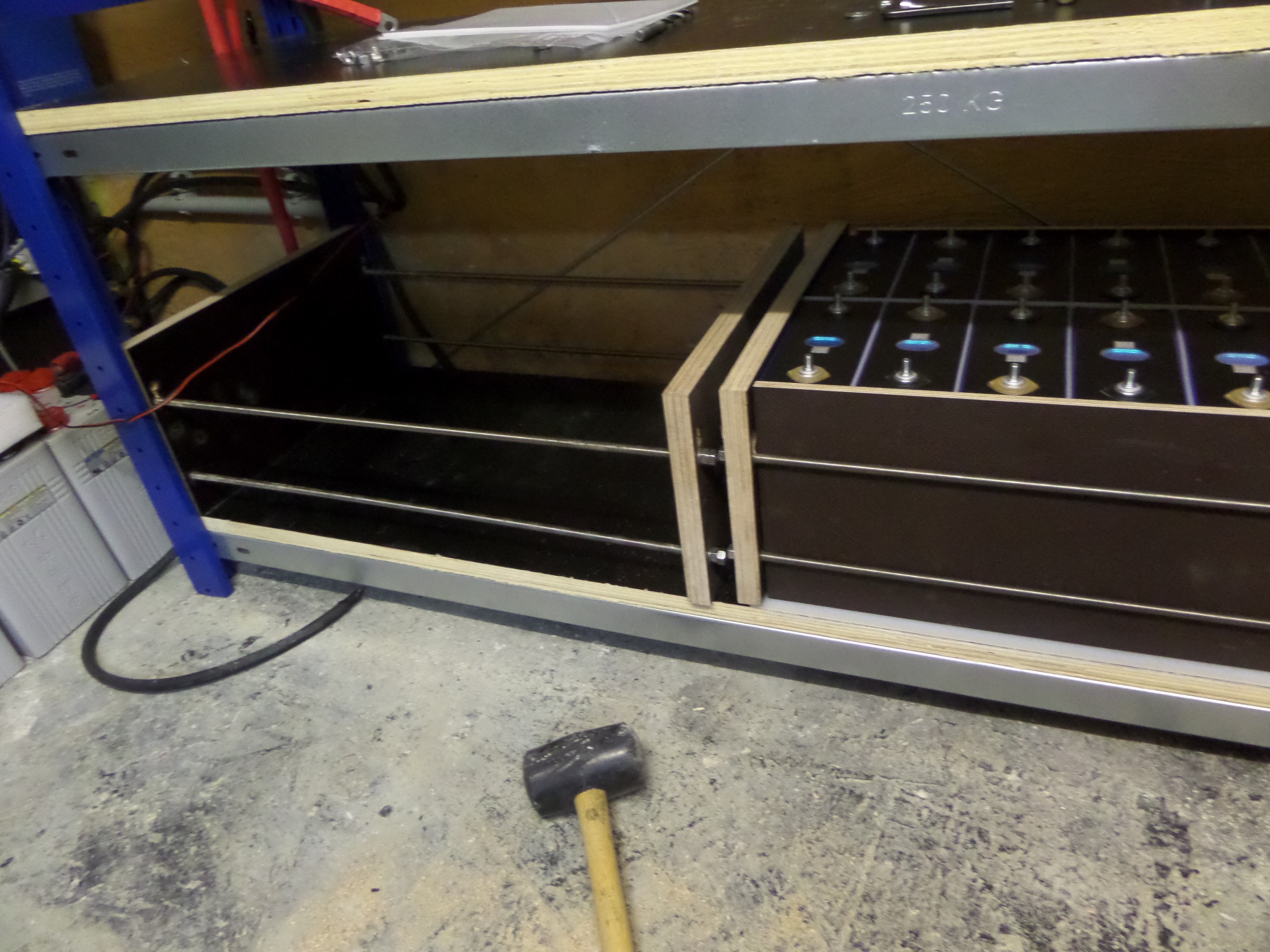 Aufbau der Zellen am entgültigen Standort. Unterer Boden (Schwerlastregal 1,30x0,40m und 250kg Tragboden, belegt mit Siebdruckplatte 21mm)