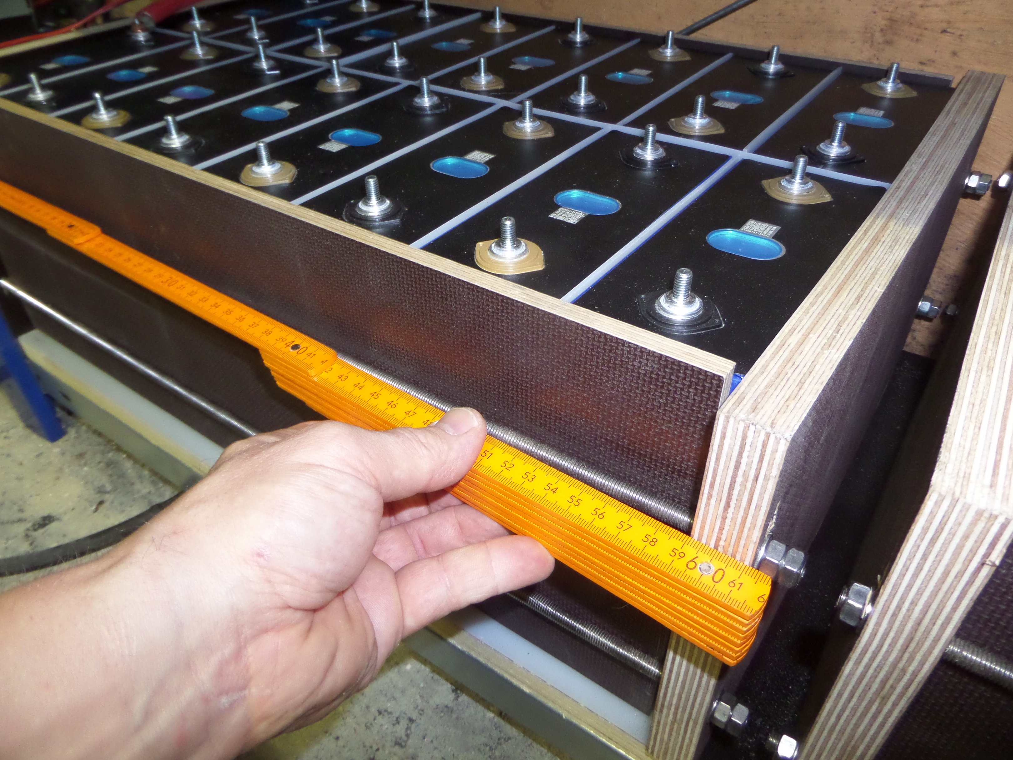 Und wie fest hast du deine Gewindestangen angezogen?590mm (ergibt sich aus 72mmx8(Zelle) + 7x2mm(Zwischenlage))