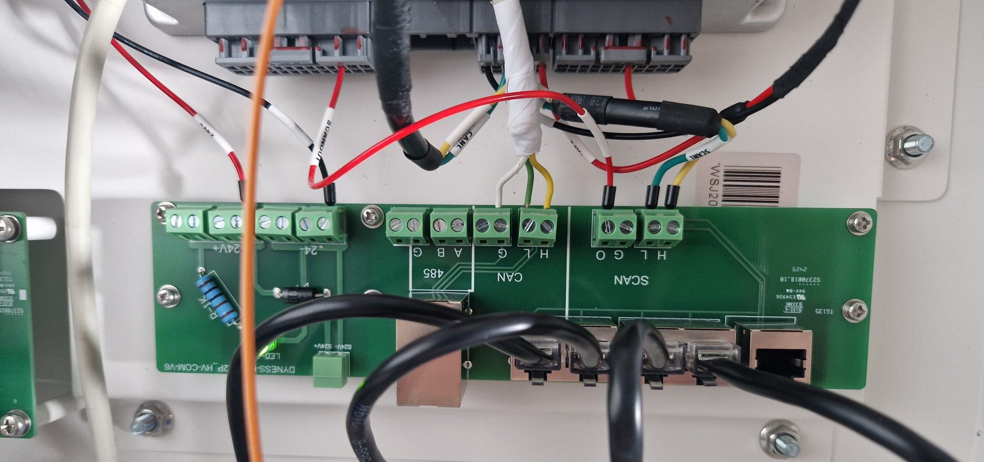 Ich habe versucht den CAN-Bus von unten (siehe Bild mit SCAN, CAN und 485 Ports) oder von dem Port der dann zum WR geht (weißes Netzwerkkabel) auszulesen.