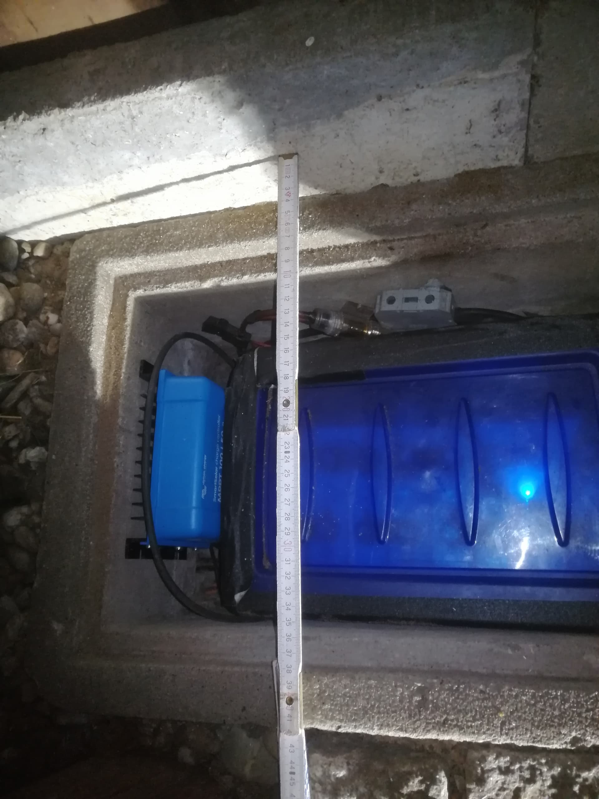 Das ist ein 8 Jahre alter DIV'ler im Außeneinsatz. Montage im Erdboden, damit einfacher Nachtfrost den Akku nicht erreicht. Dennoch sind Temperaturen im Winter um 1 Grad, mal mehr mal weniger möglich. Im Winter wird nur Licht benötigt (zusammen 100 Watt) und eine Pumpe von 900 W im Kurzzeitbetrieb. Im Sommer läuft die Pumpe auch 5 Stunden dank 2kWp.