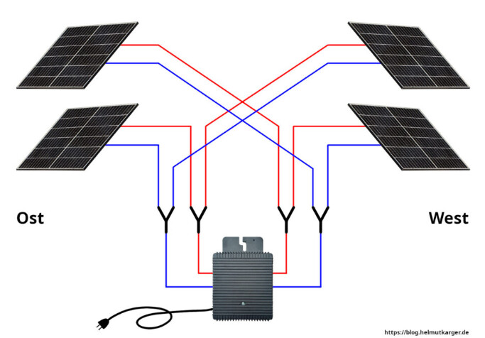 Weil aber ein MPPT oft auf 400 W begrenzt ist, macht es Sinn, die Module zu verschalten, die eher zeitversetzt ihre Maxiumalleistung haben. Damit nutzt du den Eingang besser aus über den Tag.