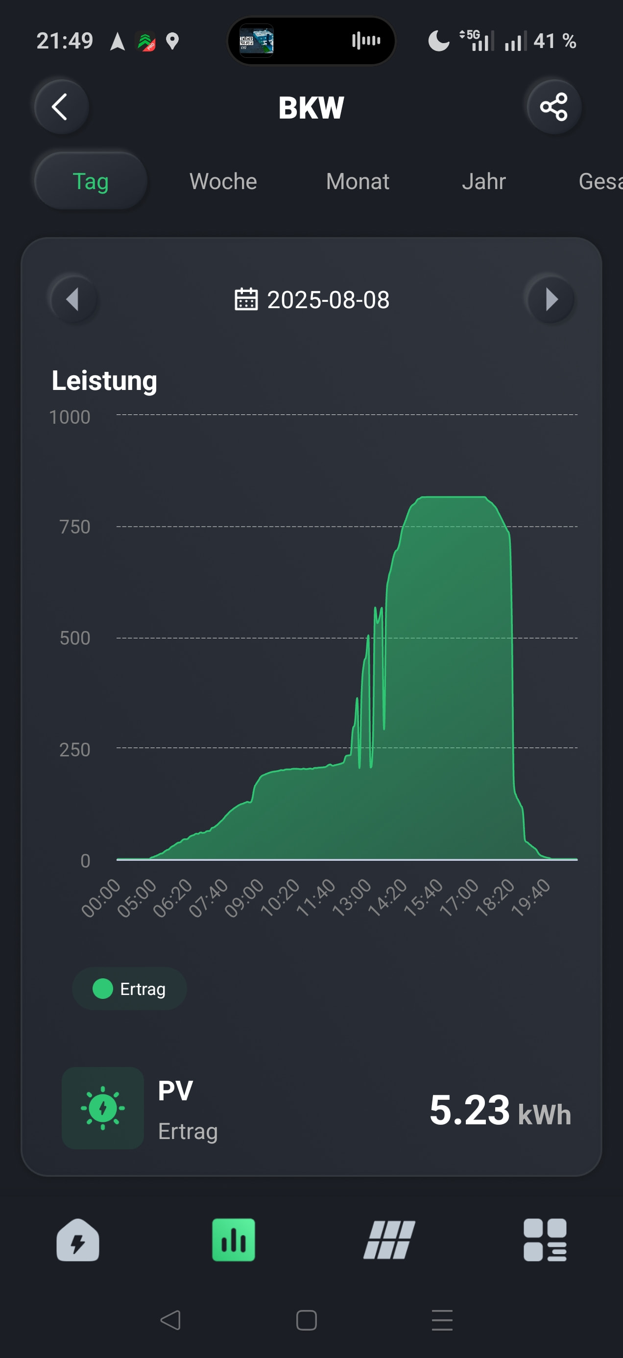 Ich habe derzeit eine BKW ohne Akku. Jahresstromverbrauch (2 Personen Homeoffice) rund 3.500kwh. Derzeit verbaut: 1800 Watt Modulleistung (8x FS20) an einem Hoymiles HMS-2000 4T (mit Hoymiles DTU-WLite-S).