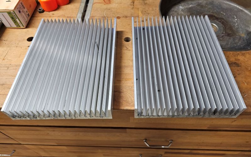 Ich habe mir einfach über Kleinanzeigen gebrauchte Kühlkörper gekauft und sie zurecht gesägt, mit Wärmeleitpaste und zwei einfache Rahmen zusammen gesteckt.