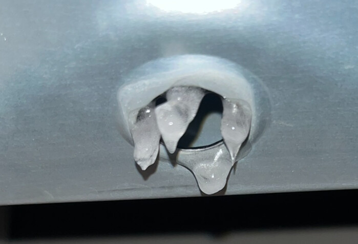 Ich habe ca. 1 Minute nach Start vom Video die Heizung eingeschalten - ca. 1 Minute nach dem Einschalten ist der Eiszapfen “abgeflogen”. Wäre also ev kein schlechter Ansatz.