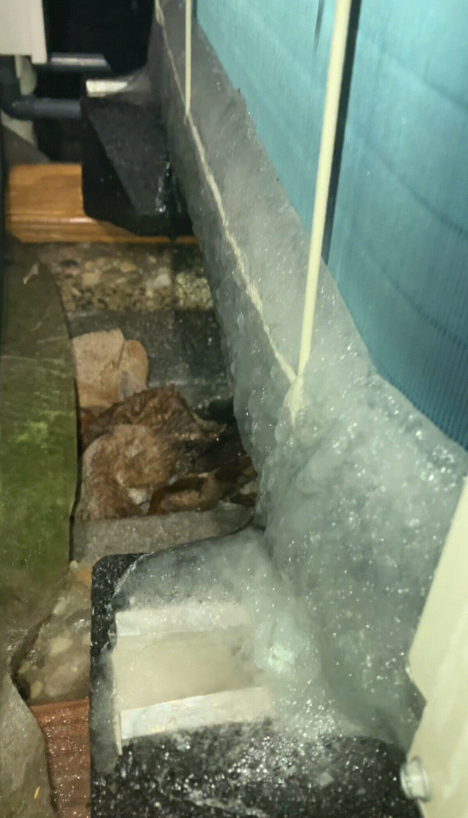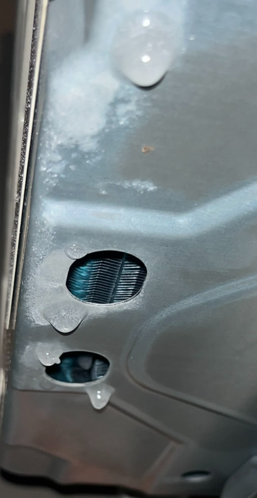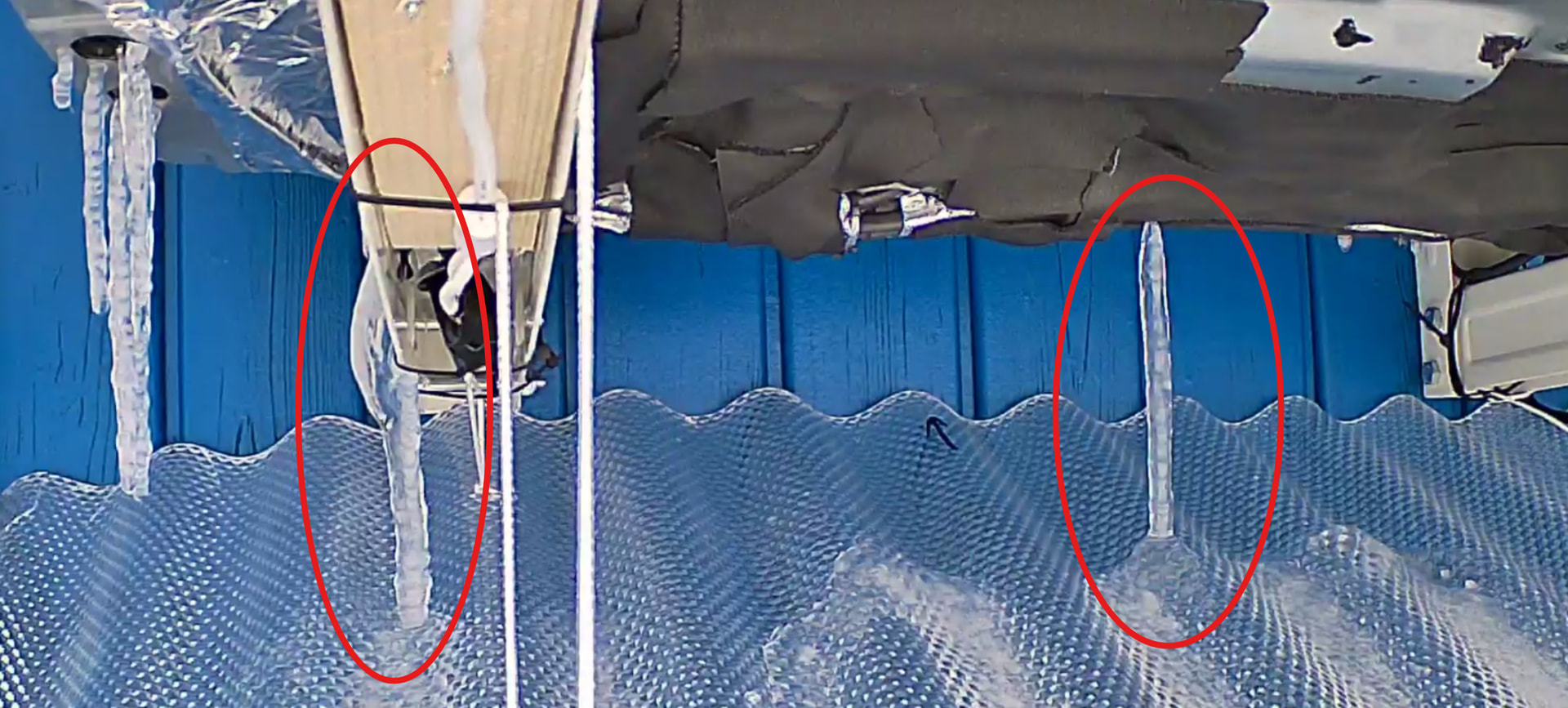 Meiner Ansicht nach sollte man sich damit beschäftigen, WIE so eine Vereisung entsteht. Und so weit ich das bisher bei mir beobachten konnte, fängt es IMMER bei den Ablauflöchern an. Was ja auch klar ist, denn dort ist der Übergang innen - aussen und an den Kanten kann sich sehr gut Eis bilden. Es bilden sich “Nasen” die dann anfangen zu Eiszapfen zu wachsen: