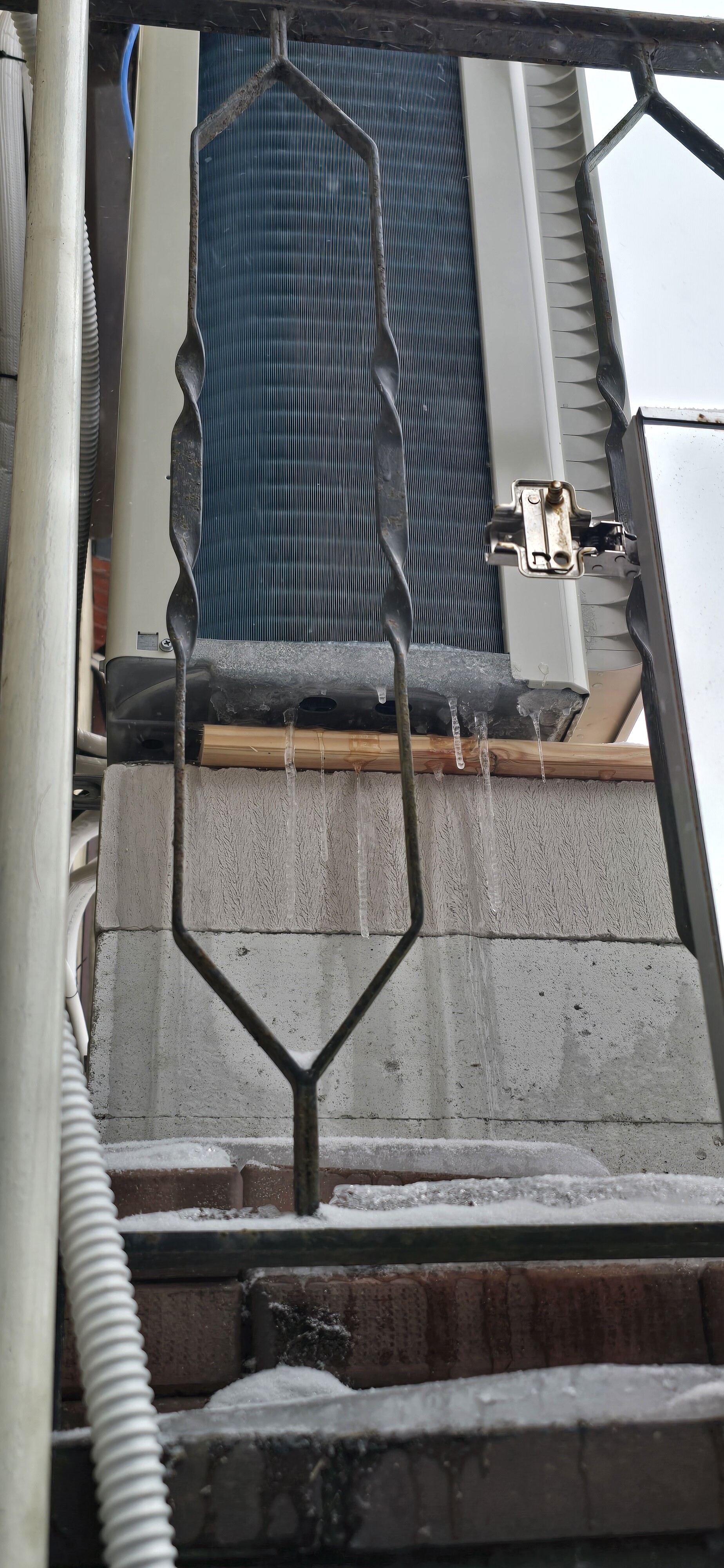 Das 2. Gerät hat nichts dergleichen, hat ebenfalls Dach drunter zum sammeln vom Tauwasser, vergleichsweise sehr viel weniger Eisbildung…