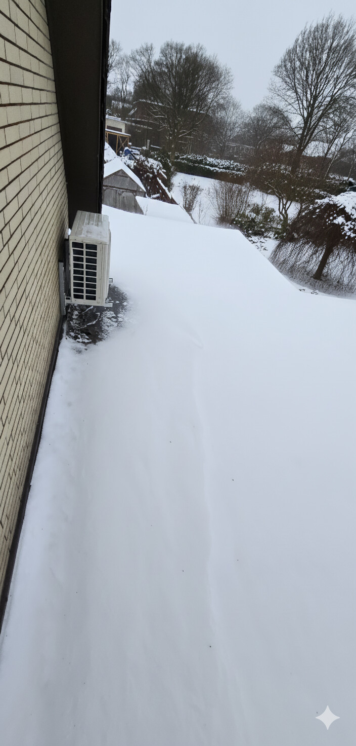 Meine Gree Nordic und meine Daikin Nepura bei aktueller Schwerwetterlage und mit Wannenheizung, keinerlei Eisbildung an den Geräten. Die Gree Heizung scheint stärker nach unten Abzustrahlen, wenn man die Bilder vergleicht. Die Daikin hat weniger Abstand zum Boden als die Gree, dennoch ist dort nur mittig der Schnee angetaut. Ich würde fast sagen die Daikin hat den Schnee nur durch das warme Tropfwasser angetaut, während die Gree wirklich großflächig Wärme von der Wanne abstrahlt.