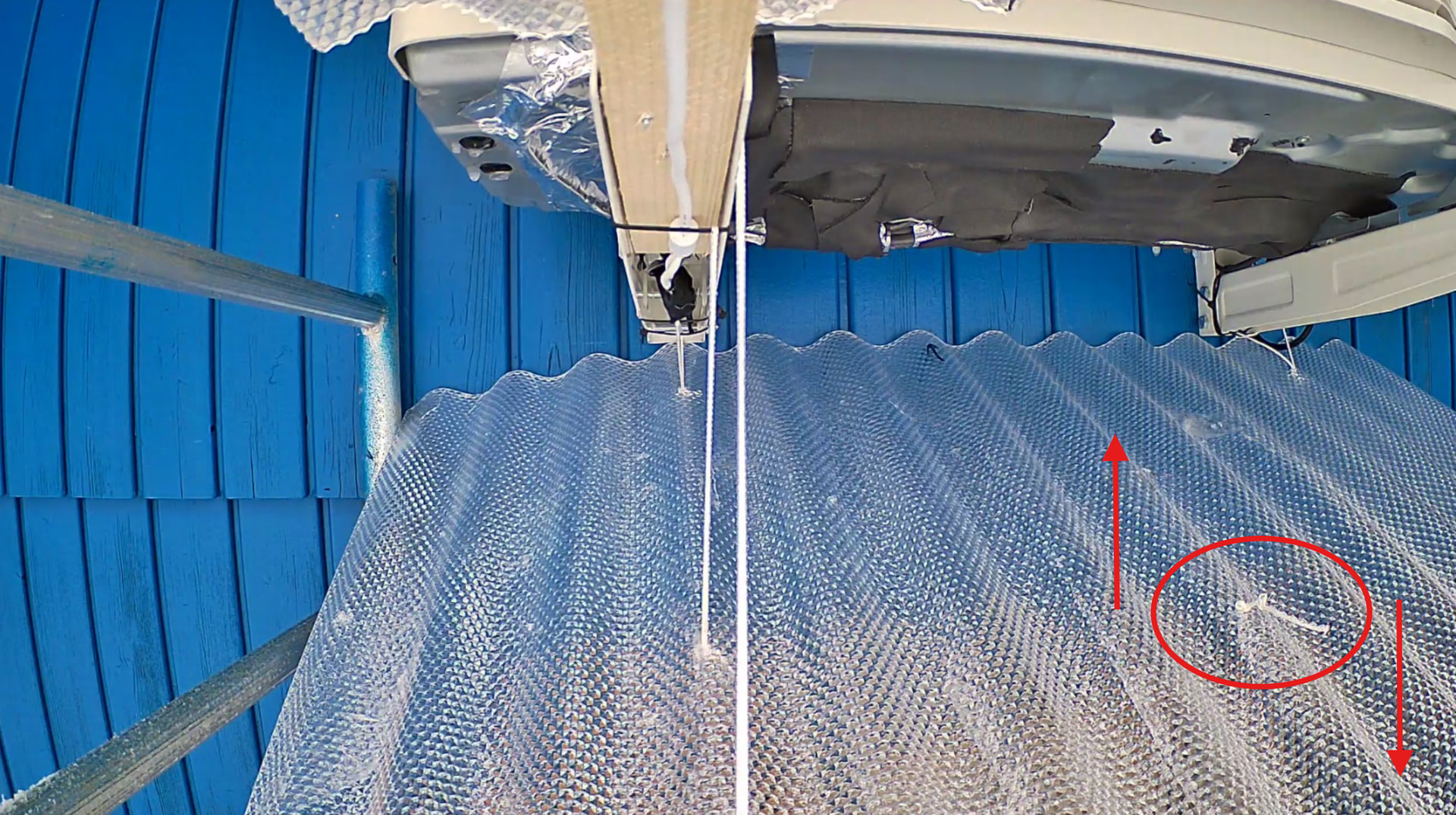 Ich habe einfach in eine der “Oberwellen” ein Loch gebohrt und Schnur durchgeführt. Die Schnur hängt einfach runter auf den Boden, durch ziehen an der Schnur kann man das Plaxiglas runter ziehen - das Eis bricht und rutscht ab. Das Plexiglas federt immer wieder zurück, es reicht wenn man ein paar mal zieht…