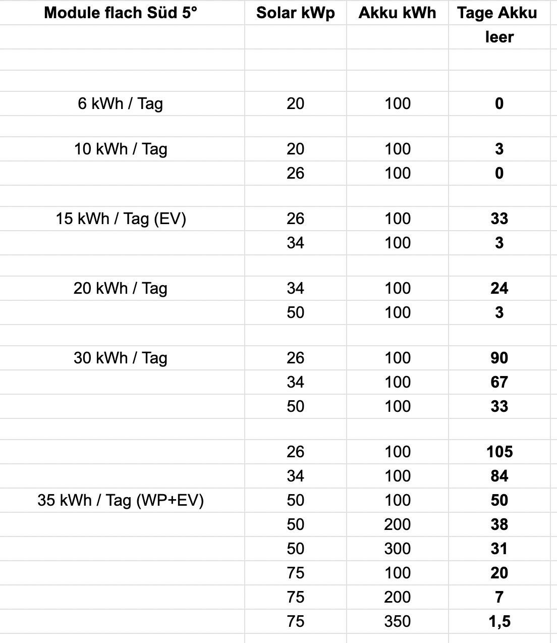 Ich habe seit einigen Jahren eine kleine Insel mit knapp 800Wp Modulleistung (Glas und flexible Module am Balkongeländer), 2 Parallel verschaltete 12 V LFP Akkus mit zusammen 300Ah. Diese Akkus werden über insgesamt 3 Laderegler geladen, 2x 20A MPPT Laderegler von EPever und 1x ein PWM Laderegler. Der Wechselrichter ist ein 3000W Gerät, mit einer Kurzzeitleistung von 6000W und einem Ruheverbrauch von 8W (diese Geräte gibt es nicht mehr, der Nachfolger hat einen höheren Ruheverbrauch von 30W). Die max. Leistung dieser Insel liegt bei 2000W, das ist die Grenze, die die zwei Akkus können. Diese Leistung tritt ab und zu auf, wenn Kühlschrank und Gefrierschrank gleichzeitig anlaufen. Die Anlage ist im Sommer ausreichend für die EDV (Homeoffice), Kühlschrank, Gefrierschrank und Stehlampen, sowie Hifi und ein paar andere Verbraucher. Im Dezember ist die im Winterschlaf, da braucht es wirklich Tage mit klarem Himmel, dass die Akkus geladen werden können. Der Nutzen liegt ziemlich kontinuierlich bei 500 kWh Strom im Jahr. Der ganz zweifellose Nachteil sind die 12V, das würde ich heute so nicht mehr machen.