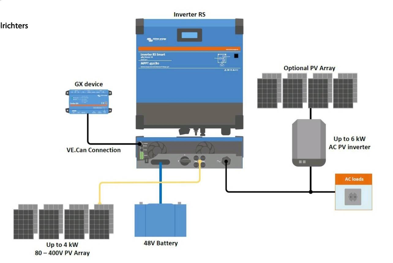 Der vorteil des rs smart 48/6000 solar ist, dass ich am Ausgang normale 800 W BKW betreiben kann. Diese Wechselrichter sind also direkt auf die Stromkreise meines inselnetzes geschaltet und versorgen die Verbraucher. Wenn die BKW mehr strom erzeugen, als verbraucher benötigen, nimmt der victron den überschüssigen Strom auf und lädt den Akku. Wenn der Akku voll ist, zieht der victron die Frequenz hoch und dadurch schalten die normalen BKW ab. Das ganze läuft vollautomatisch. Ich habe das überprüft, das funktioniert alles sehr gut. Gerade, wenn man noch wo ne ecke hat, wo man normale 800 W BKW installieren kann ist dieser victron wechselrichter sehr gut geeigent, damit man möglichst viel PV Panel einsetzen kann.