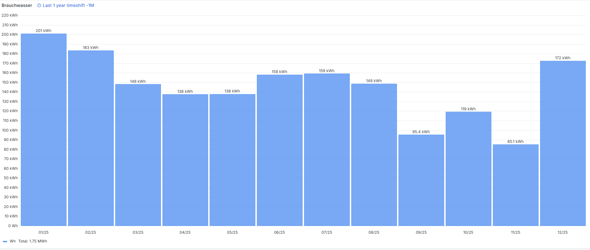 Der Gasverbrauch liegt für 2024 bei 10.175 kWh. Davon entfallen ca. 13% auf Brauchwasser. Dazu kommen ca. 1.000 kWh von der Solarthermie, die in den Heizbetrieb geflossen sind. Über die Heizkörper sind (Wirkungsgrad der Gasheizung von 100% angesetzt) 9.850 kWh Wärme ins Gebäude gebracht worden. Real etwas weniger. Vor Installation der Klimaanlagen lag der Gasverbrauch bei ca. 16.000 kWh/a.