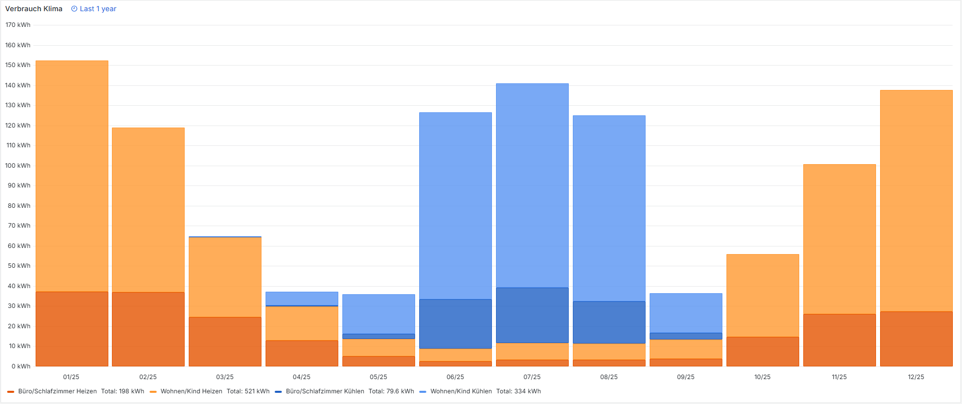 Der Stromverbrauch fürs Heizen mit Klima liegt bei 707 kWh, für Kühlen im Sommer bei 394 kWh.