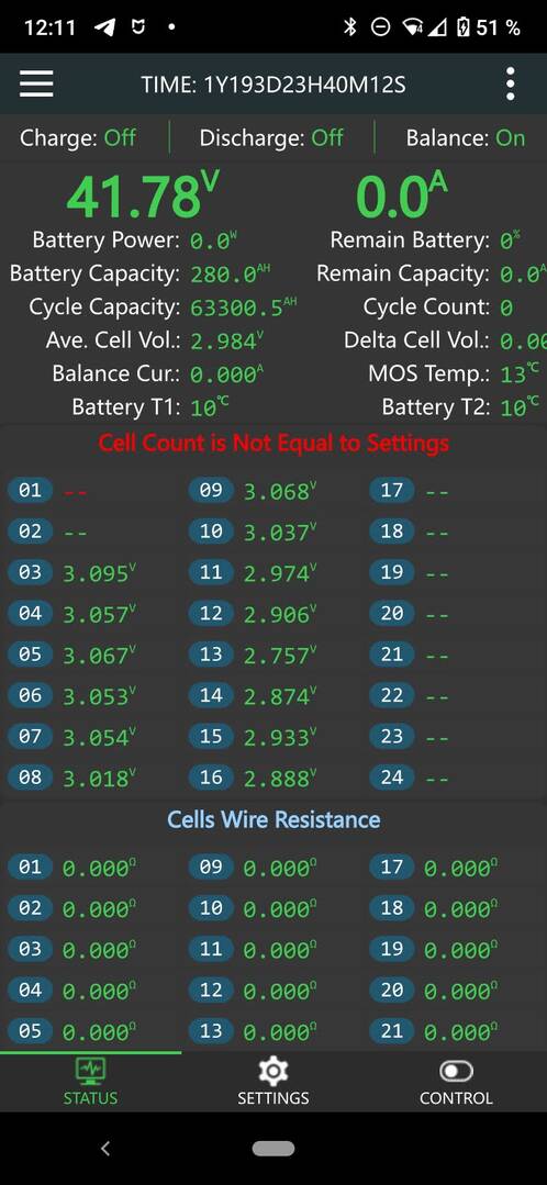 Das BMS sagt mir immer "Cellcount ist not equal to settings", ich kann bei den Settings auch einstellen was ich will, die Meldung bleibt.