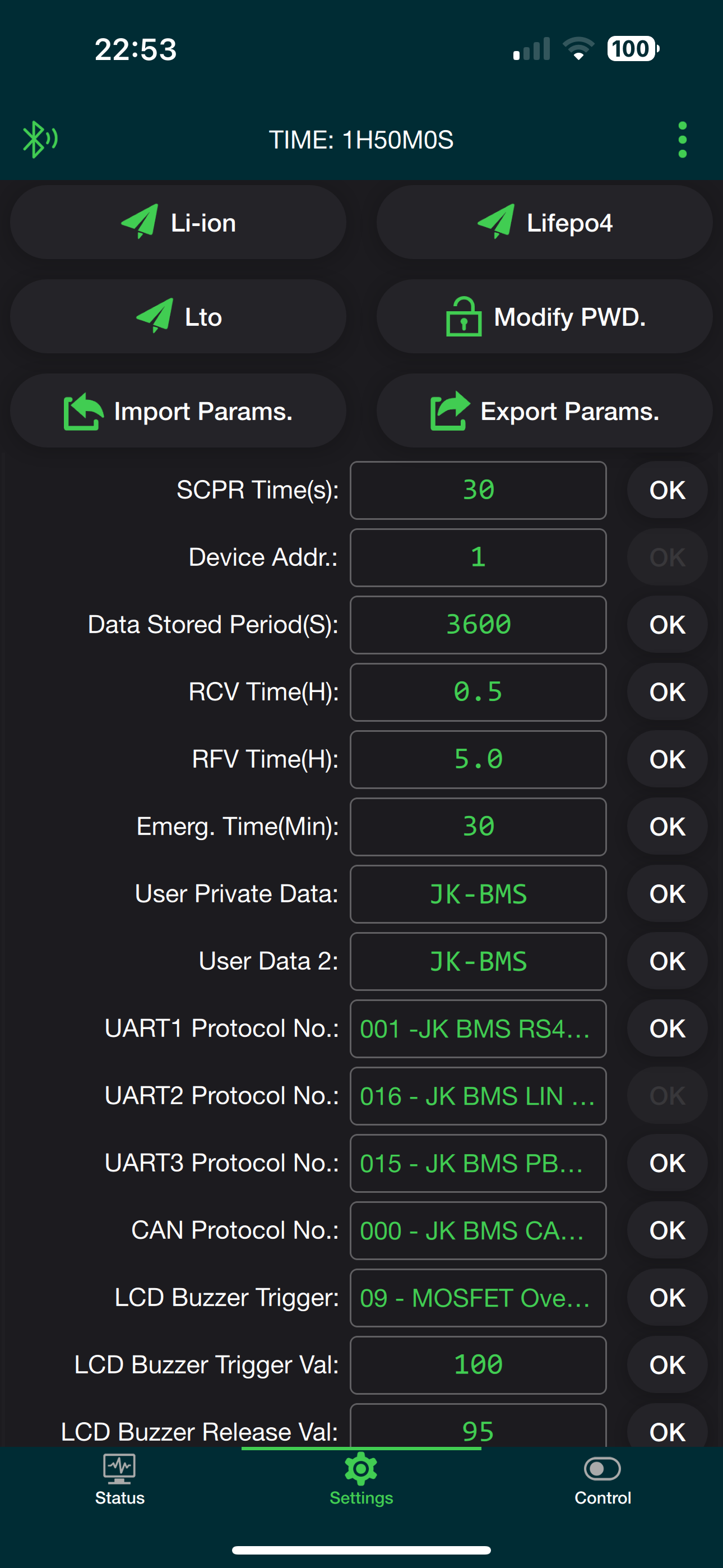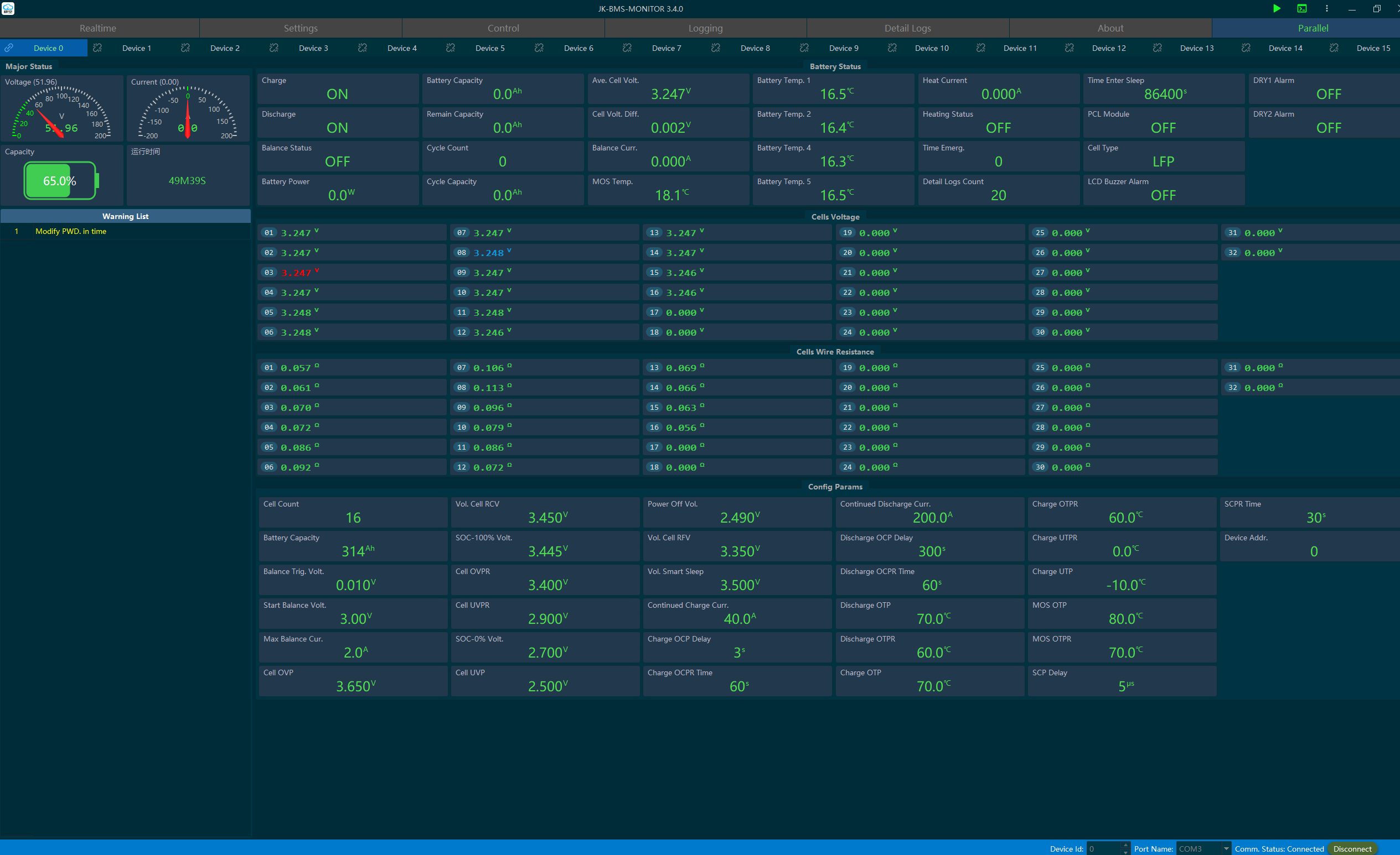 “Entweder oder” ist die Devise. Du kannst entweder alle Akkus einer Kette readonly überwachen oder aber das Device mit Adresse 1 am DIP alleine ändern. Du musst also jedes mal jeden Akku zum Device 1 machen und umstöpseln.