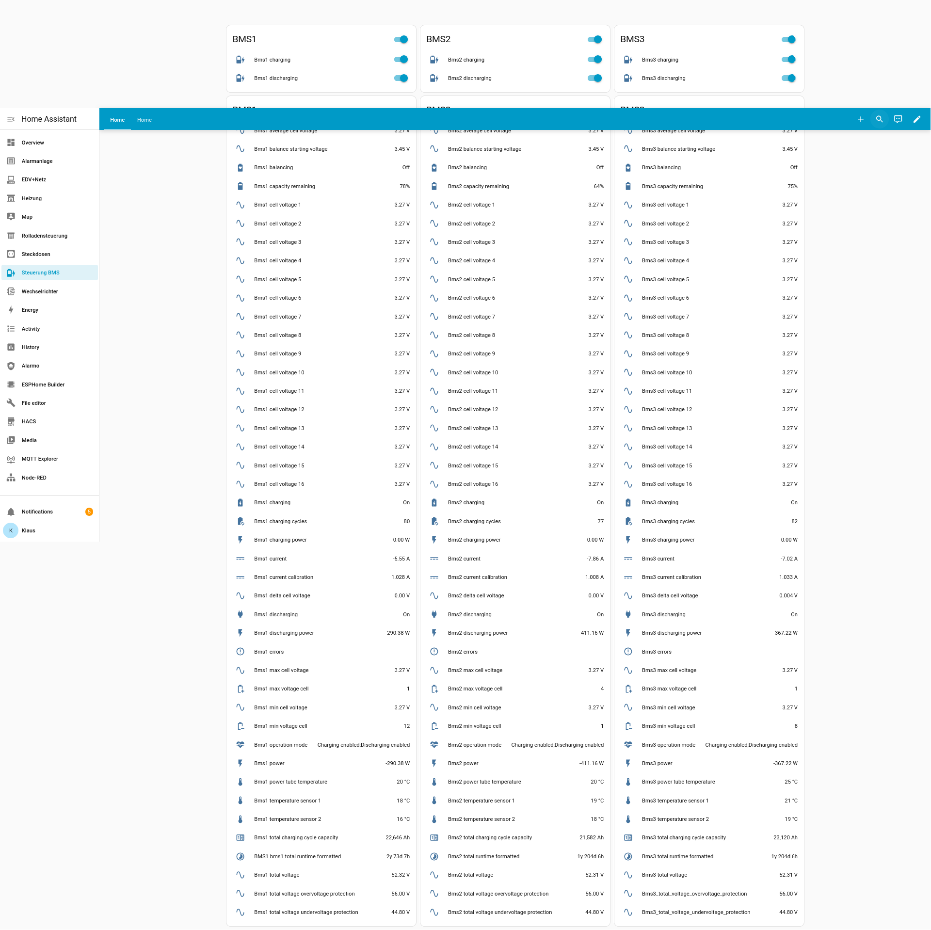 Für meinen Geschmack sind die Spannungen der einzelnen Zellen ganz schön weit auseinander. Wenn die JK BMS richtig eingestellt sind und balancieren, sollte das eher so aussehen: (ich betreibe 3 Bänke mit 280Ah Zellen und 3 von den “alten” JK BMS. Die letzte Stelle der Zellspannung lasse ich weg, lohnt sich meiner Meinung nach nicht)
