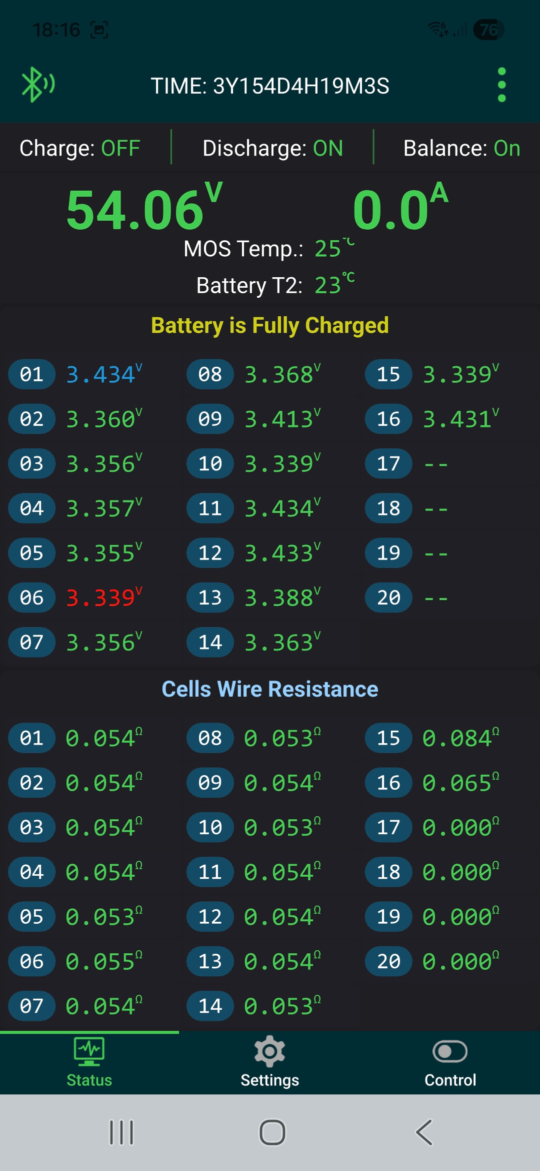 Du meinst die ‘wire resistance’ und nicht die Zellspannungen? Würde ich unbedingt nachmessen, wie oben beschrieben. Kaufe Dir ein gutes Multimeter (40 Euro reichen) und dann miss die Einzelspannungen nochmal (im Leerlauf) und vergleiche mit den BMS-Werten. Dann eine ordentliche Last auf den Akku (gerne 20A und mehr) und miß den Spannungsabfall an den Polbrücken.