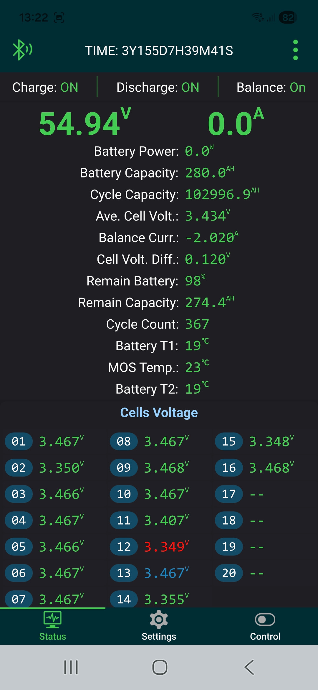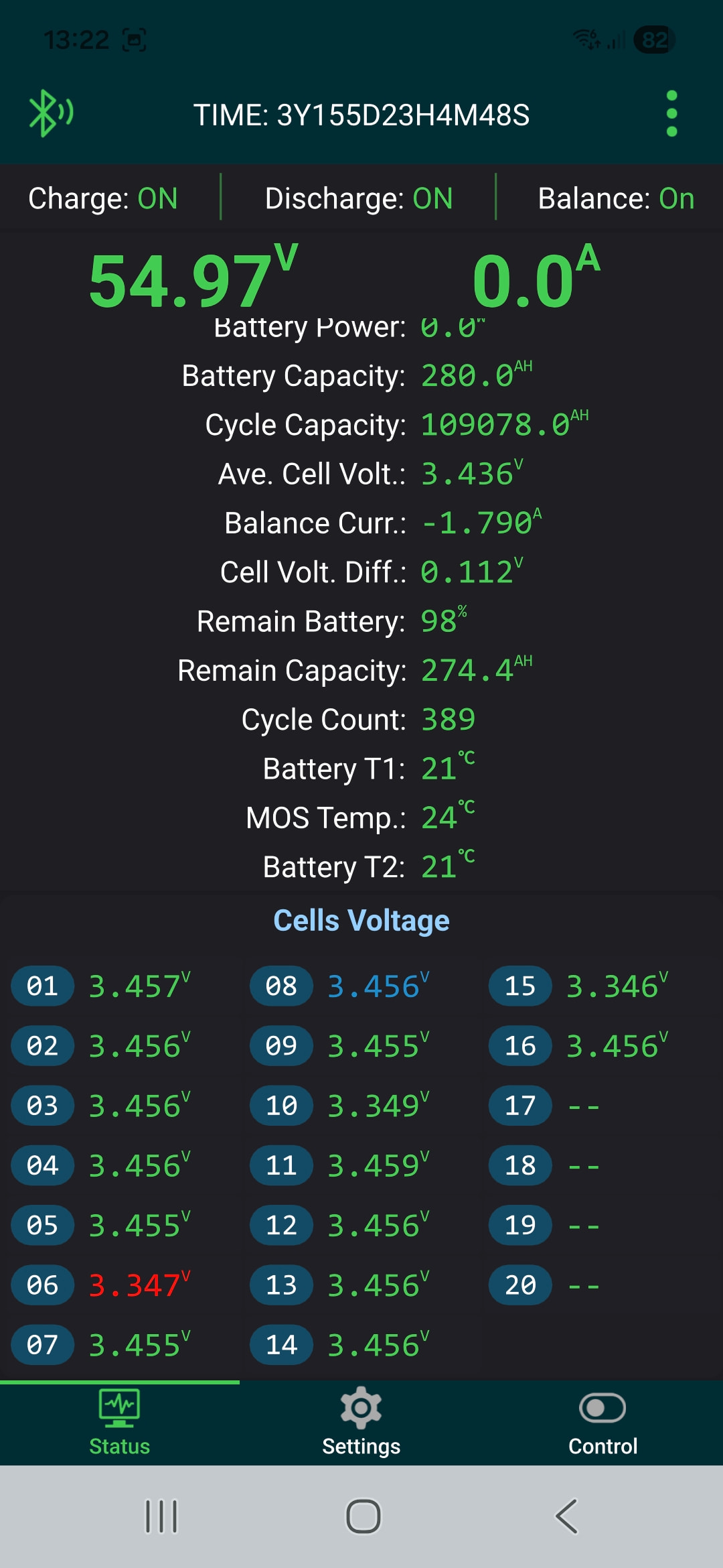Damit auch nachts weiter balanciert werden kann, bin ich inzwischen dazu übergegangen, den Wechselrichtern das Laden zu überlassen. Da die mittlerweile in den FLOAT-Modus gegangen waren, hatte das zur Folge, dass die einzelnen Zellspannungen wegen der eingestellten Float-Voltage von 54,4V wieder unter die 3,45V fielen. Da unterhalb von 3,45V jetzt bei mir ja jetzt nicht mehr gebalanced werden darf, wurde nicht mehr gebalanced. Deshalb habe ich die Floatvoltage auf 55V hochgesetzt. Jetzt balanced das BMS wieder. Liegt in diesem Fall vielleicht sogar ein legitimer Grund vor, warum man das Balancieren vielleicht auch unterhalb von 3,45V erlauben sollte? Also wie gesagt: nur in diesem Fall.