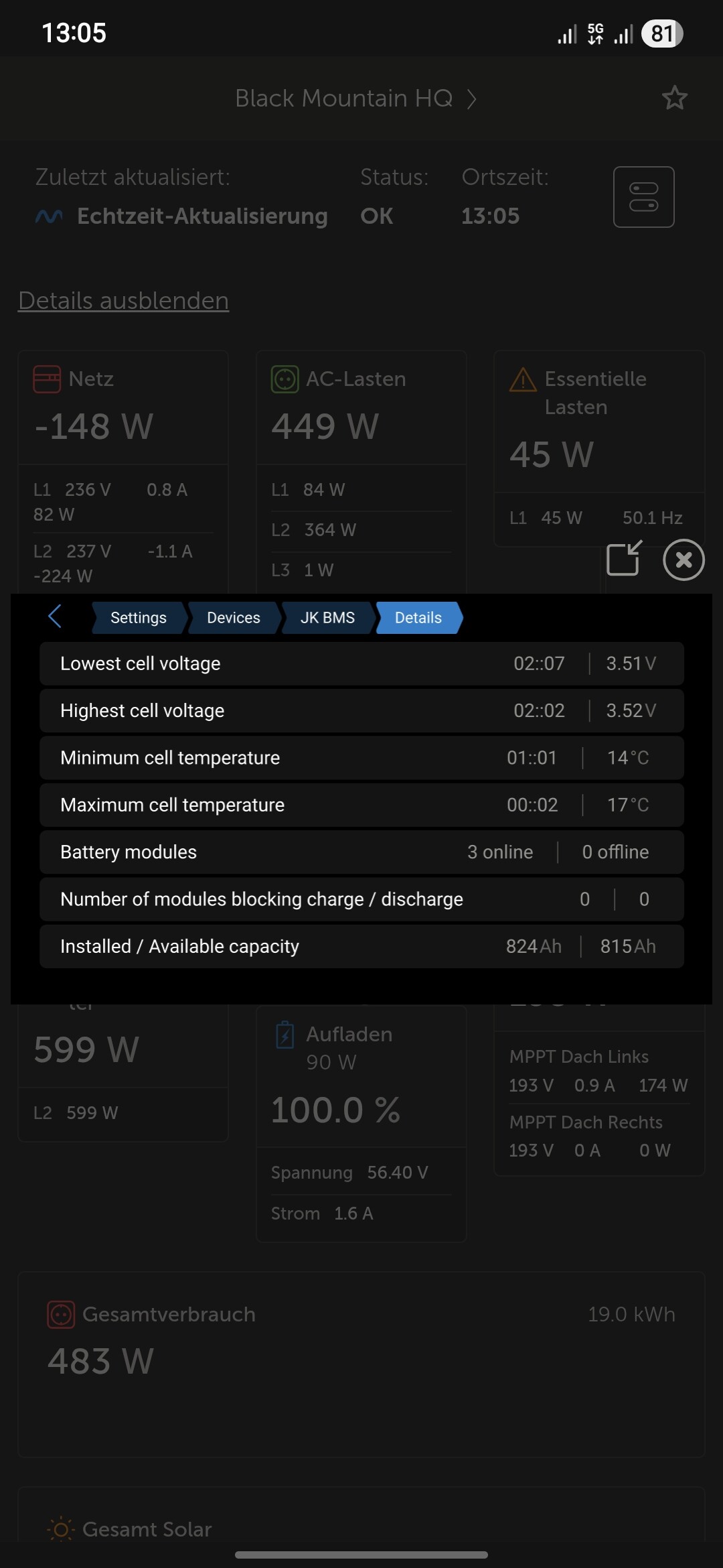 Die fehlenden Zellspannungen beim Anschluss des JK per CAN sieht man in der Remotekonsole in den Infos zum JK —> Details. Dort wird einem die jeweils schwächste und höchste Spannung angezeigt, inkl. Nummerierung der Zelle. Reicht völlig um zu sehen, ob irgendwo der Wurm drinnen ist. In meinem Fall hat gerade Zelle 7 im 2. Pack die niedrigste und Zelle 2 in Pack 2 die höchste Spannung. Die ersten beiden Zahlen repräsentieren das jeweilige Akkupack und die letzten beiden Zahlen die Zellnummer.