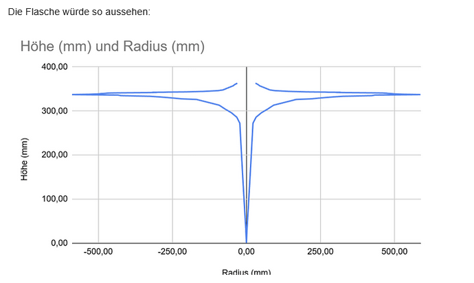 Man kann sich gar nicht genug mit den Ladekurven der LiFePo4 Zellen auseinandersetzten. Damit die besser “In den Kopf” geht habe ich basierend auf einer Ladekurve die Form einer Flasche skizziert, die 360mm hoch ist und ein Volumen von 280 Centilitern hat. Die 360mm sollen die Zellenspannung darstellen also 10mV pro mm. Das Volumen soll die kapazität von 280Ah darstellen also 1Ah pro 0,1l.