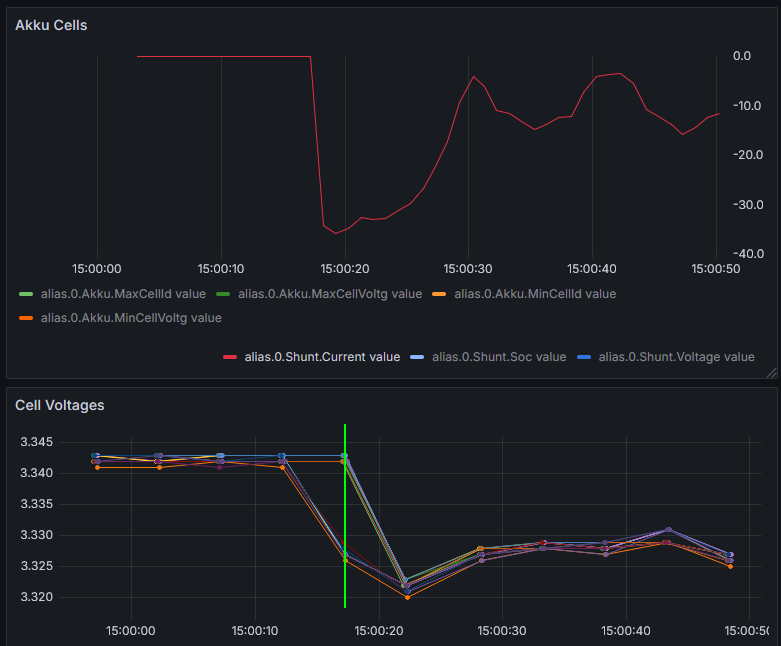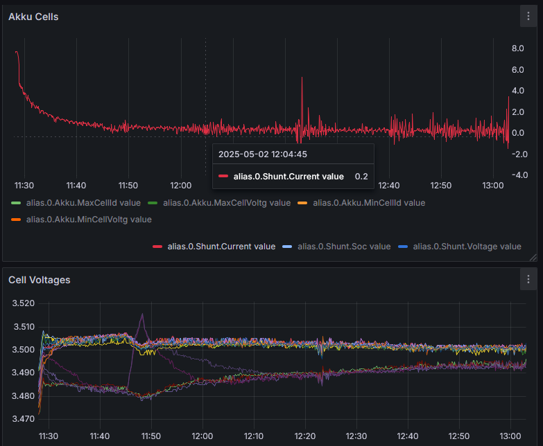 Im Effekt hatte ich für deinen Fall recht, 2 Zellen mussten balanciert werden, der Grund mag richtig sein, dass es mit dem zu tiefen Balancereinsatz zu tun hat auch, aber meine Beschreibung, warum die Spannungen im Quirl trotz Ladestrom fallen können - in deinem Fall - ist falsch. Genau das, was dir auch Probleme bereitet hat, zu verstehen.