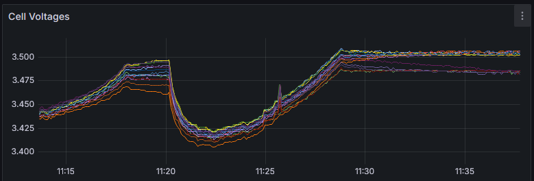 Jup weil er RCV/RFV macht... und lässt damit über das BMS bei erreichen von Spannung XY den Laderegler steuern und den Ladestrom reduzieren damit die Spannungen nicht weiter steigen. Ergo kein normales CC-CV Ladeverfahren mit natürlich absinkenden Strom. RFV siehst du zb. zwischen 11:40 Uhr - 12:40 Uhr. Und RCV sieht man auch diesemal schön (haben wir schonmal diskutiert) an der obersten gelben Kennlinie weil sie so schön abgehackt ist. Innerhalb von 10 Minuten, von 50mv auf 10mv runter...