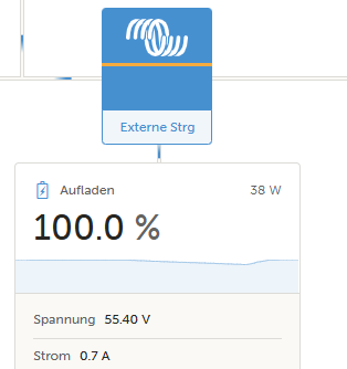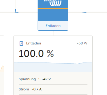 Ist der Akku im Bereich der vollständigen Ladung wechselt die Darstellung (Entladen/Laden/etc) auf Victron Ebene recht häufig unerklärbar. Das alles grob im Bereich von bis zu 60W Laden und Entladen.