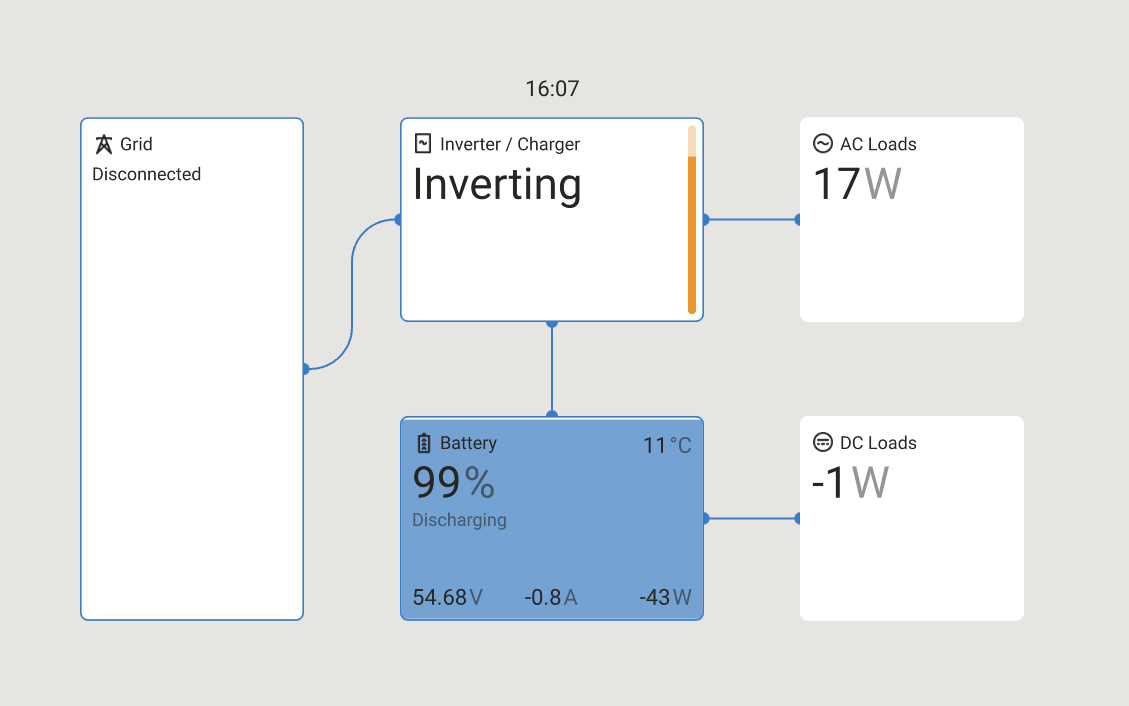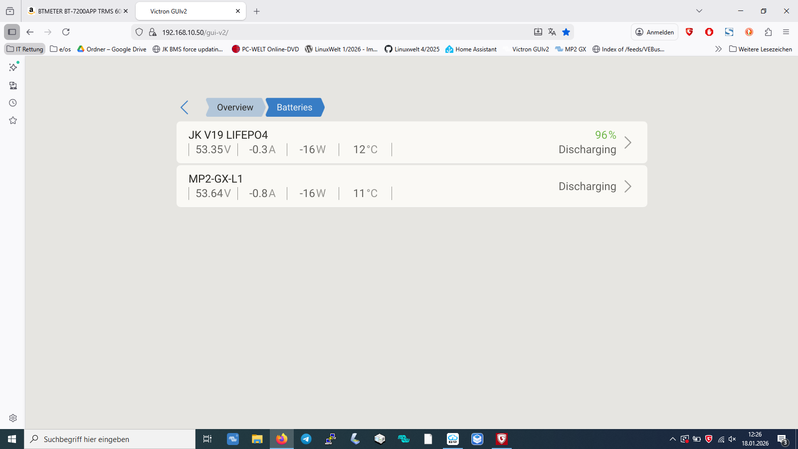 ja also der Multiplus genehmigt sich schonmal 16 Watt, bleiben also 27 Geister Watt übrig . Hast du schonmal den Strom und die Spannung des JK-BMS kalibriert? Ansonsten miss doch mal was nach dem BMS wirklich aus dem Akku gezogen wird. DC Loads sagt ja angeblich garnichts bzw. -1 Watt. ich tippe darauf das, das BMS falsche Werte ausgibt weil Strom und Spannung schlecht kalibriert sind.