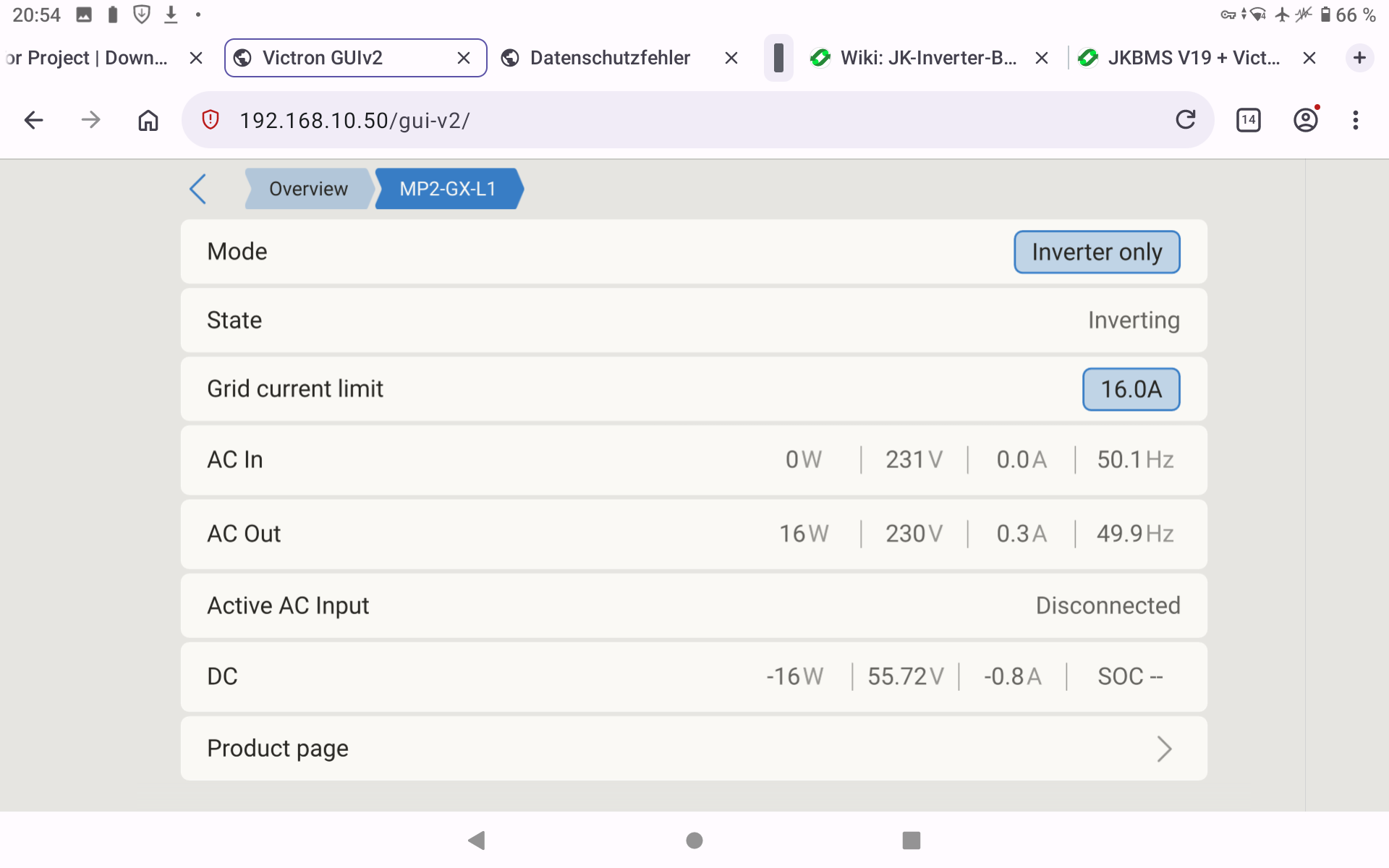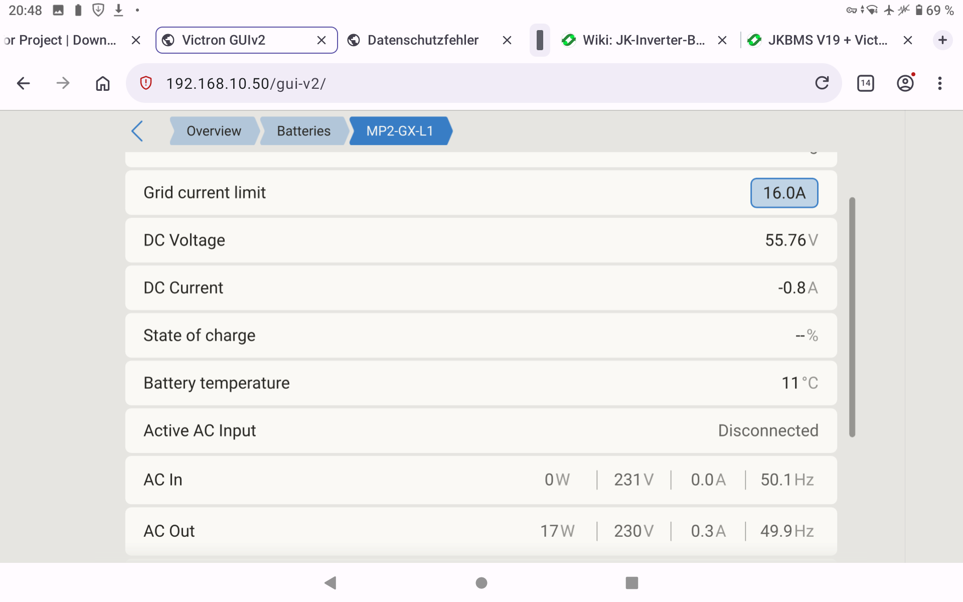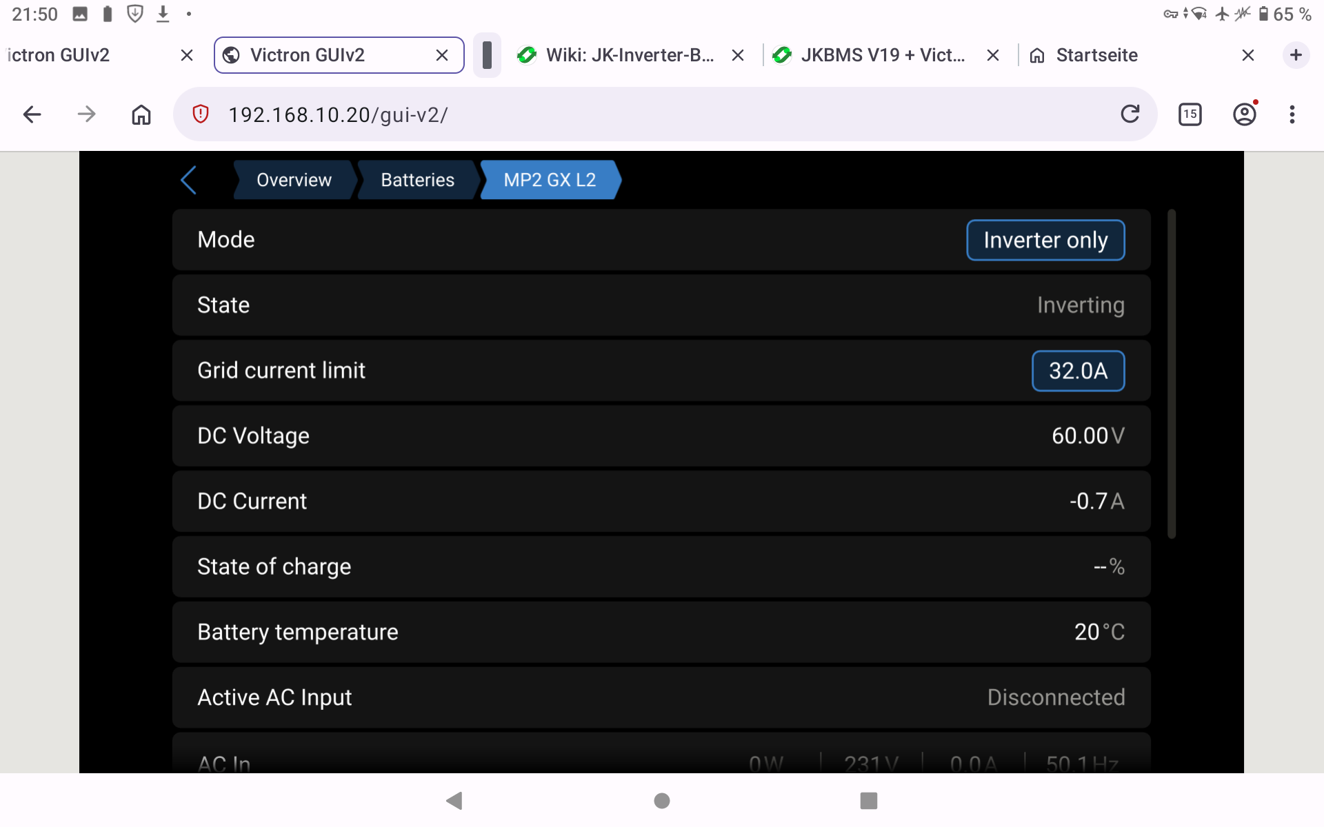 Was mich ebenfalls ein wenig irritiert hat bisher ist, ich habe noch ein zweites System, allerdings mit einer JKBMS V15 und SIB Akkus. In der BMS ist Charge und Discharge unter Control aktiv und die Leistung im Inverter-only Modus des baugleichen MP2s liegt bei ca 17Watt.