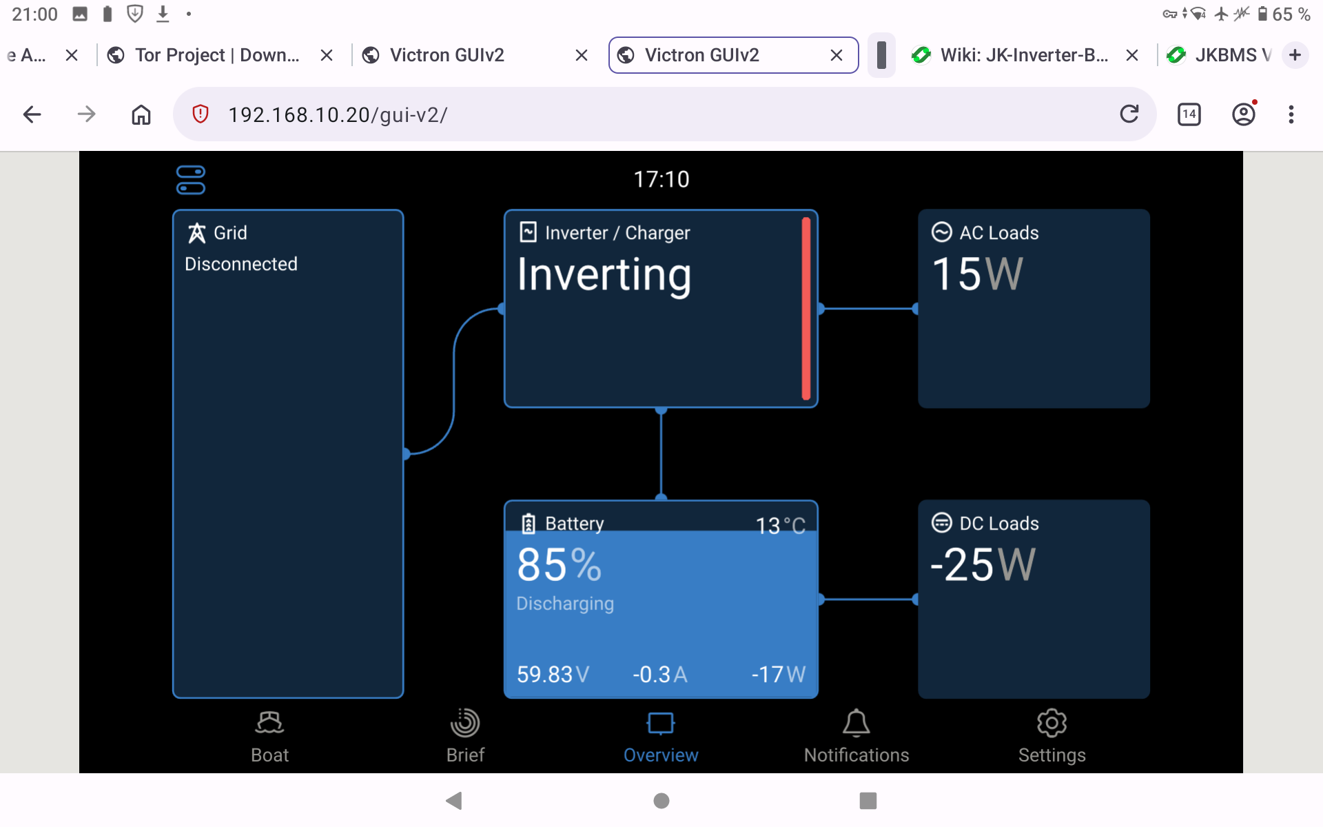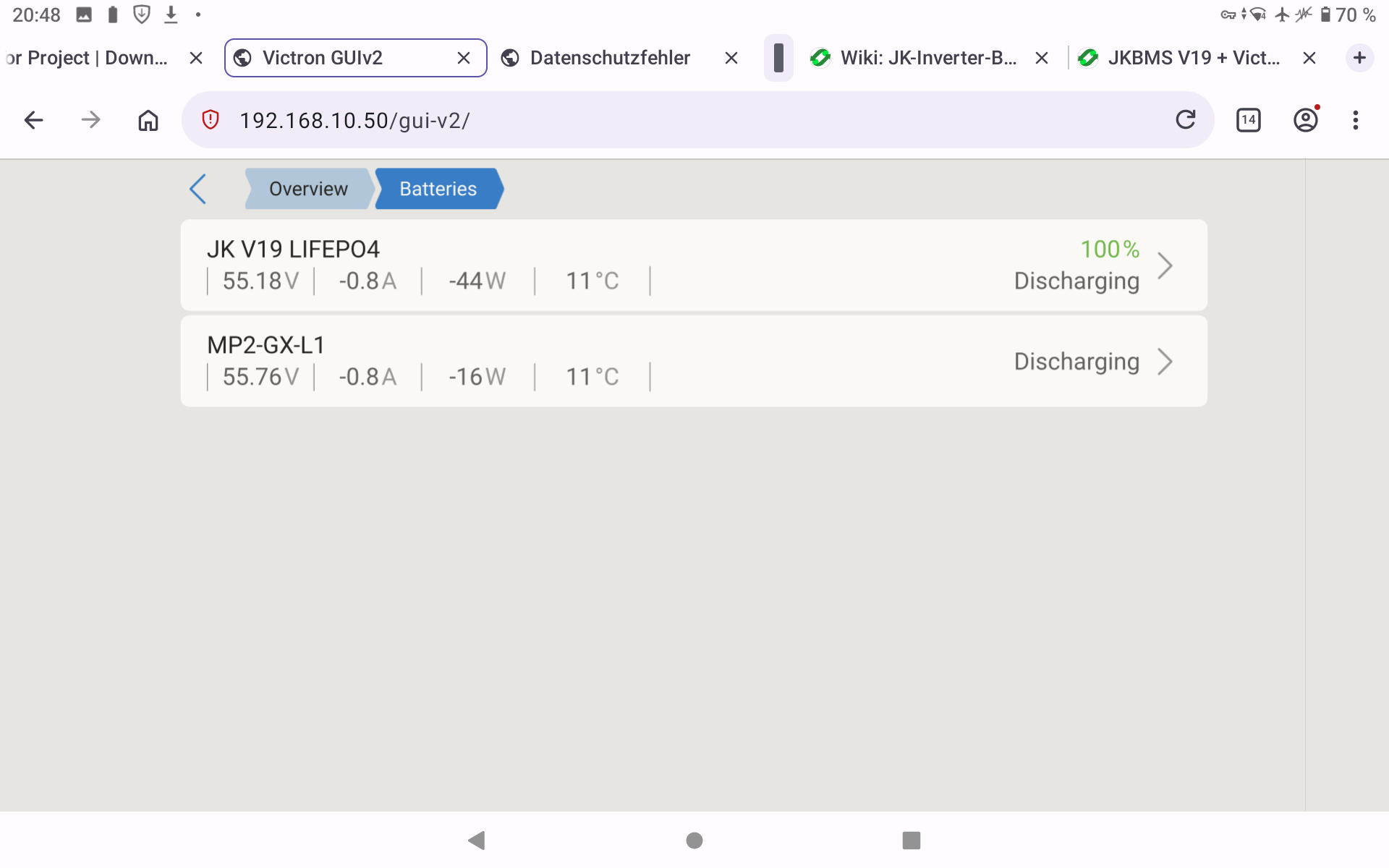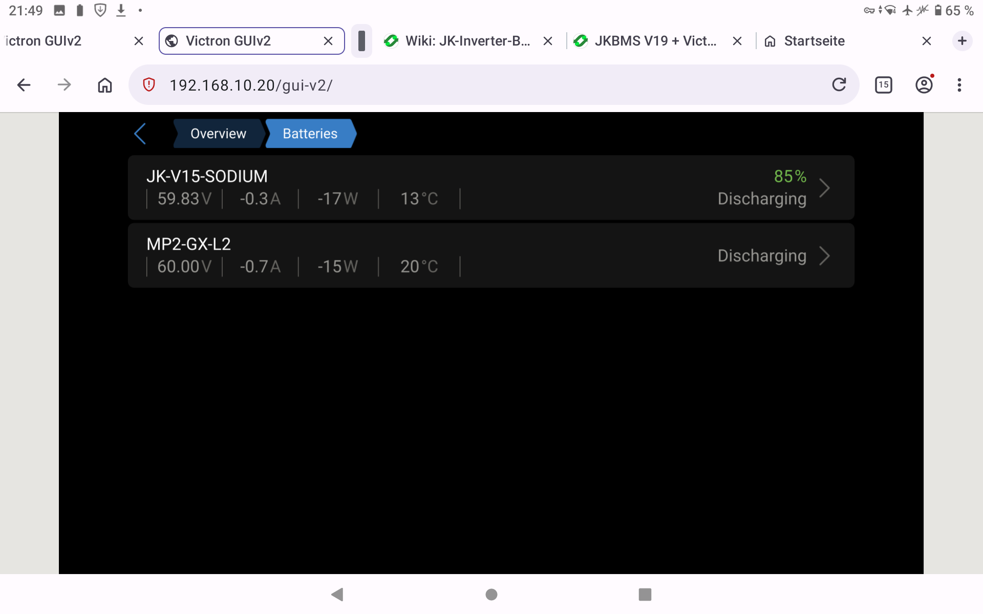 Was mich ebenfalls ein wenig irritiert hat bisher ist, ich habe noch ein zweites System, allerdings mit einer JKBMS V15 und SIB Akkus. In der BMS ist Charge und Discharge unter Control aktiv und die Leistung im Inverter-only Modus des baugleichen MP2s liegt bei ca 17Watt.
