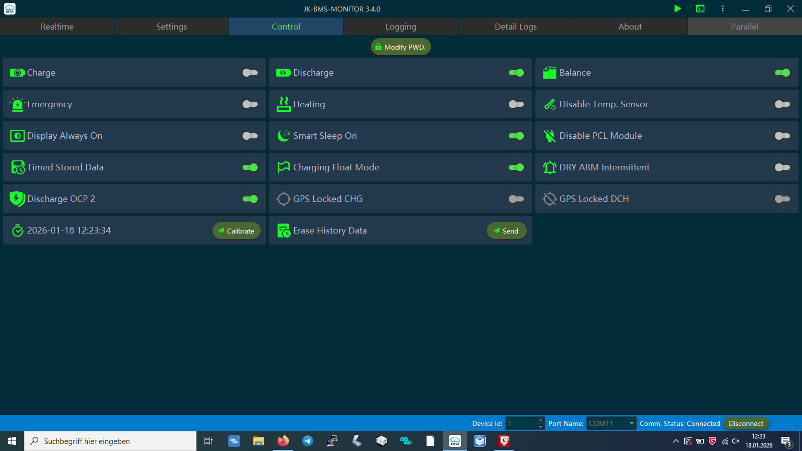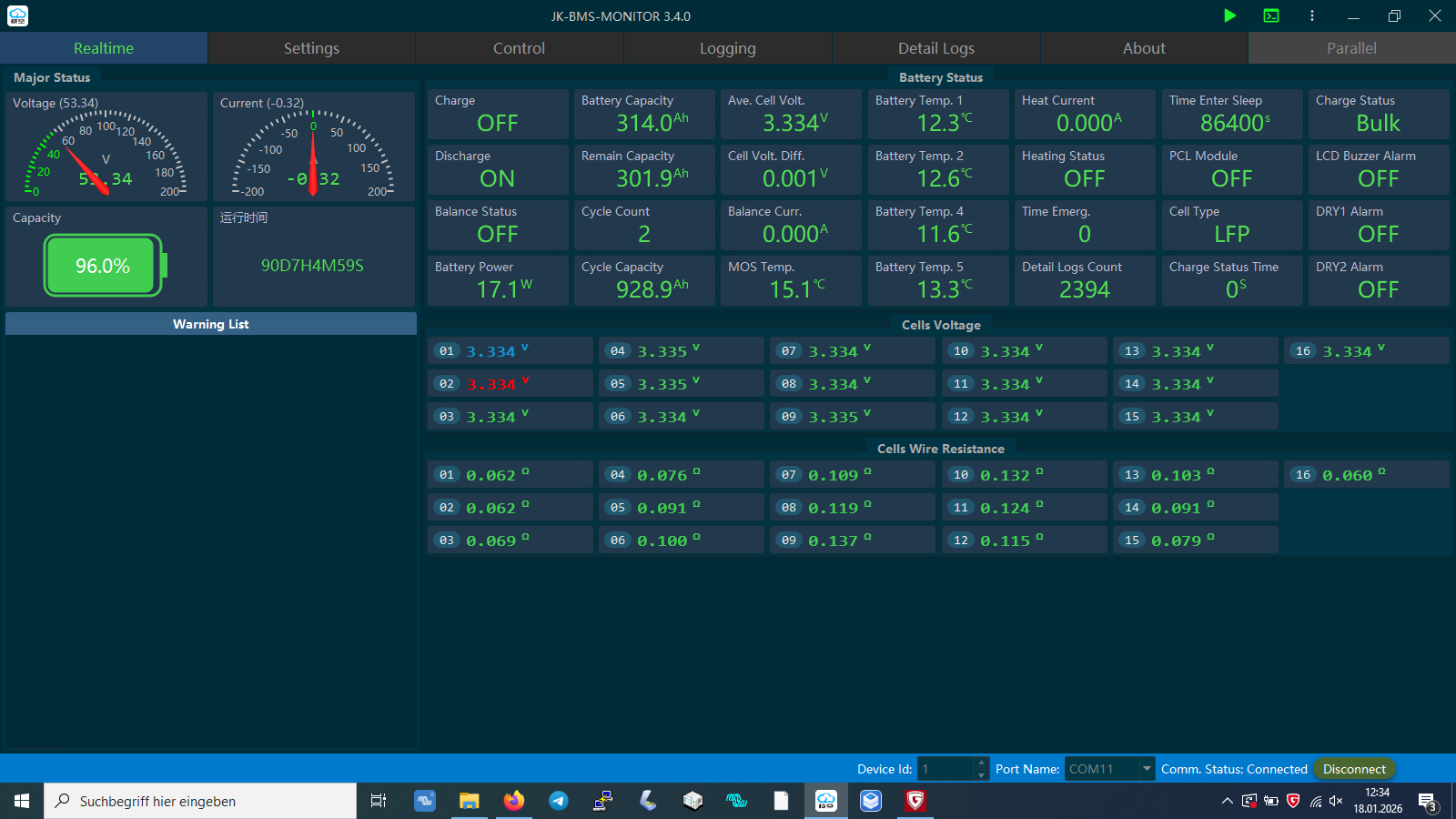 aber wie geschrieben, ich werde mal die Kalibrierung in der JKBMS V19 vornehmen und schauen, ob der Sachverhalt sich ändert. Komisch jedenfalls, dass die Leistung sich halbiert, sobald ich in der BMS “Charge” deaktiviere. Verstehe den Algorithmus nicht …