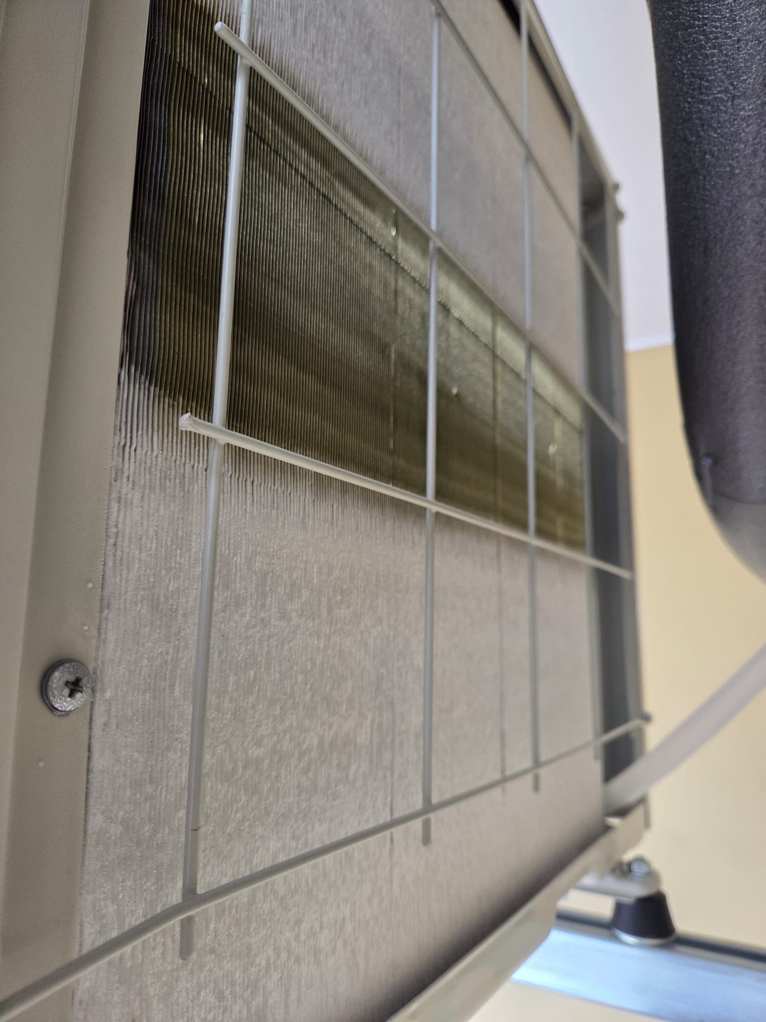 Wenn das Gerät läuft und das Register anfängt zu vereisen (was bei der Witterung ja normal ist), bleibt immer exakt in der Mitte ein breiter, horizontaler Streifen komplett eisfrei und trocken, während der obere und der untere Bereich stark bereifen.
