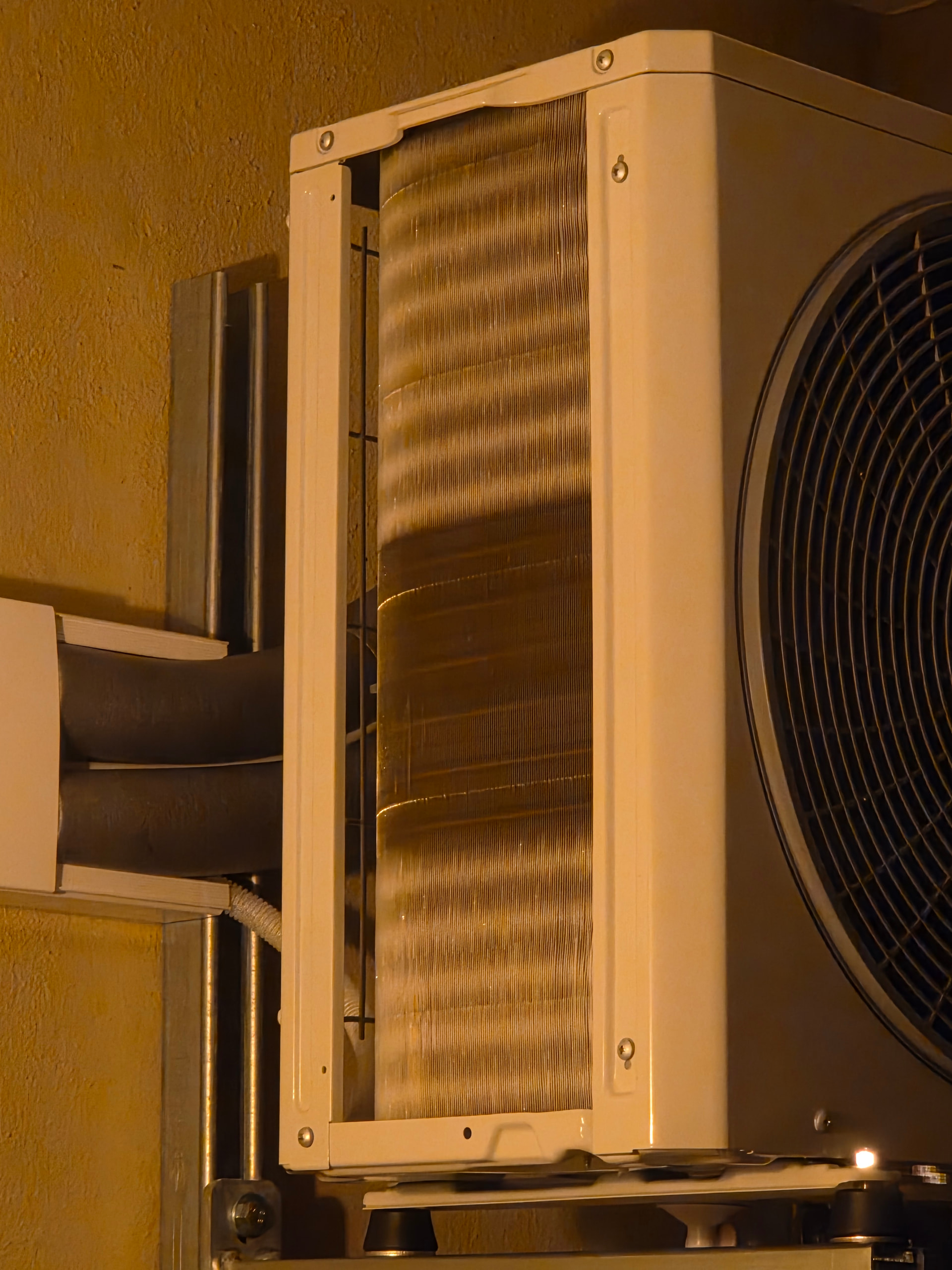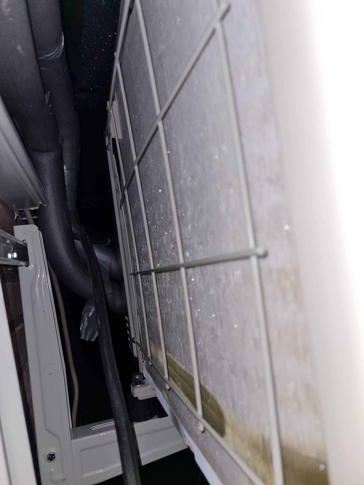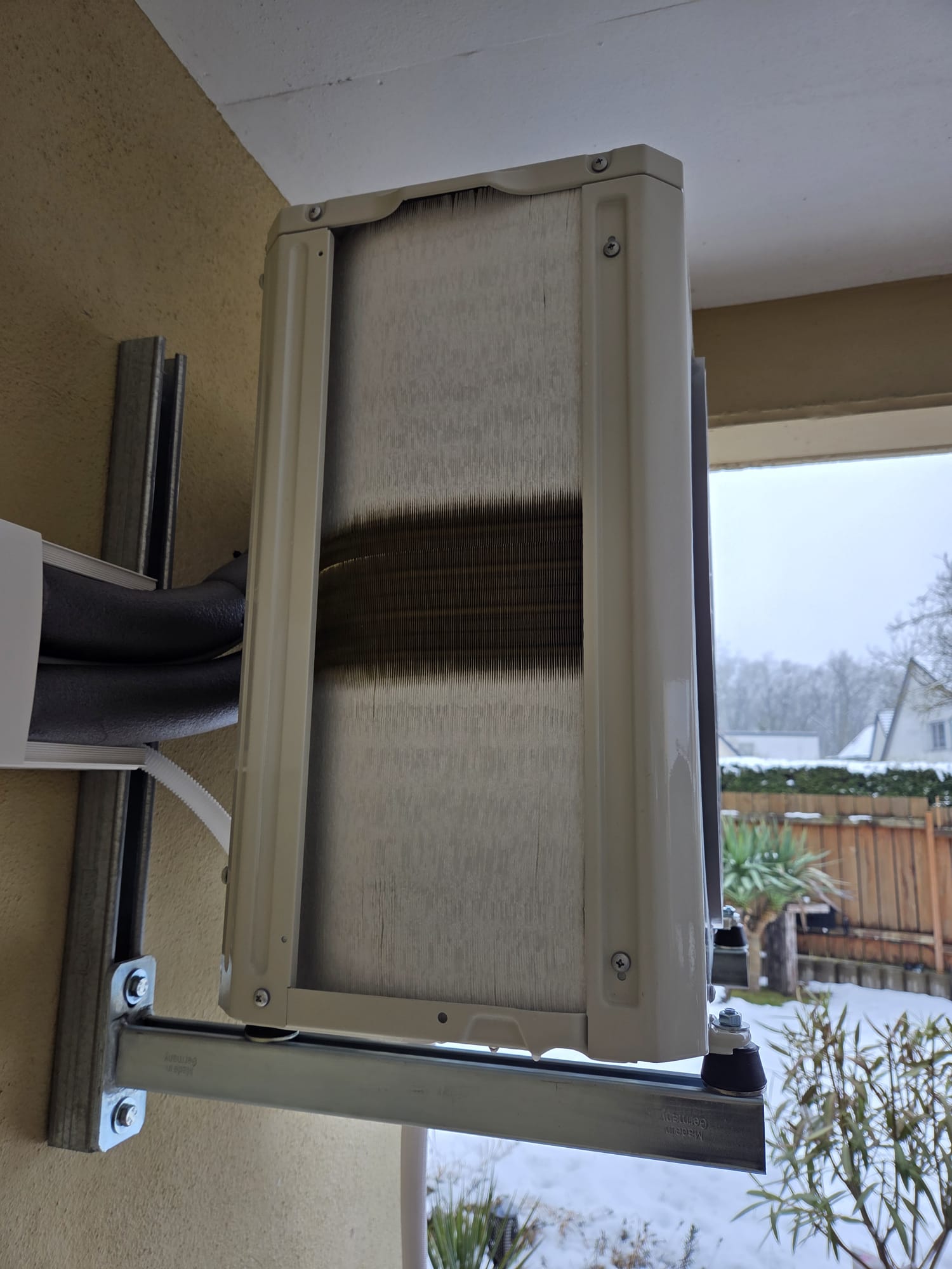 Nun zu meiner eigentlichen Frage: Aktuell nutze ich die Anlage zum Heizen (draußen liegt Schnee, wie man sieht). Dabei ist mir ein seltsames Verhalten am Wärmetauscher des Außengeräts aufgefallen.