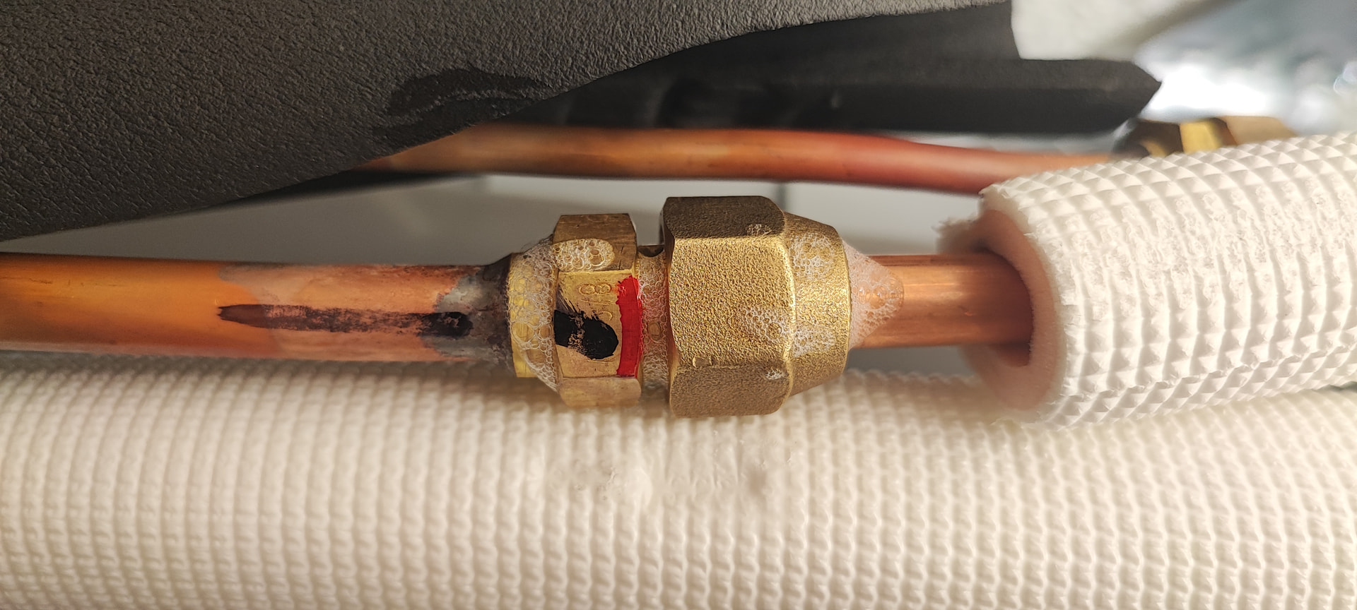 Dadurch ist beim ersten Versuch, die Ventile zur Außeneinheit zu öffnen, etwas Kältemittel ausgetreten. Abgesehen davon, dass der Gasdetektor Alarm geschlagen hat, habe ich nichts gerochen und ich war ziemlich nah dran.