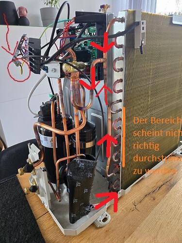 Im Bild habe ich versucht darzustellen, wie das Kältemittel vermutlich fließt. Die Pfeildicke zeigt an, wie viel Kältemittel ich in dem jeweiligen Bereich erwarte.